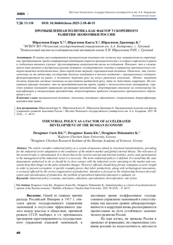 В статье рассматривается промышленная политика как система мер, направленная на структурные преобразования, предусматривающая адаптацию отрасли промышленности к условиям современного рынка и глобальным внешним угрозам. Аргументирована актуальность темы исследования. Показано, что в сложившихся ныне внешних и внутренних реалиях активное государственное участие в управлении промышленным сектором является необходимостью. Дано определение термину «промышленная политика. Отмечено, что уполномоченные на то ведомства государства должны находиться в тесном контакте с промышленным сектором, функционирующим на рынке, и постоянно держать руку на пульсе рыночных изменений. Однако, чиновники должны держать частные компании на расстоянии вытянутой руки, дабы не допустить коррупцию. На конкретном примере доказано, что на производительность труда, наряду с технологическими инновациями, серьезное влияние оказывает правильная организация производства. Акцентировано внимание на соотношении диверсификации и специализации производства, актуализирована проблема специального промышленного образования и т. д.