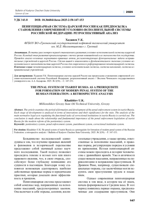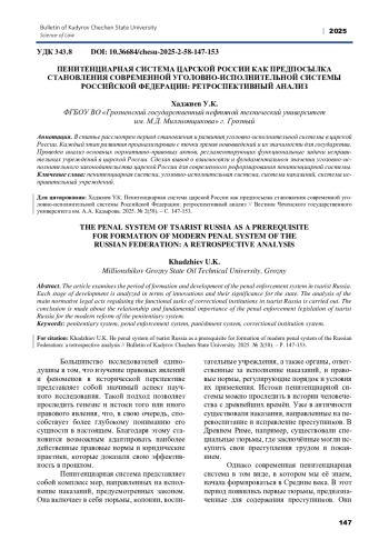 Статья посвящена комплексному исследованию предмета «История государства и права России» как научной дисциплины, изучающей процессы формирования и трансформации государственных институтов и правовых систем на различных этапах отечественной истории. Авторы анализируют ключевые периоды развития российской государственности, выделяют факторы, повлиявшие на становление правовых традиций, и рассматривают роль историко-правовых исследований в контексте современной юридической науки. В работе использованы сравнительно-исторический и системный методы, а также междисциплинарный подход, объединяющий правоведение и историю. Особое внимание уделено трудам российских учёных, таких как И. А. Исаев, В. А. Томсинов и С. В. Юшков, чьи исследования легли в основу понимания эволюции российского права. Результаты исследования подчёркивают преемственность правовых норм и их адаптацию к меняющимся социально-политическим условиям. Статья адресована юристам, историкам и всем, кто интересуется проблемами отечественной государственности.