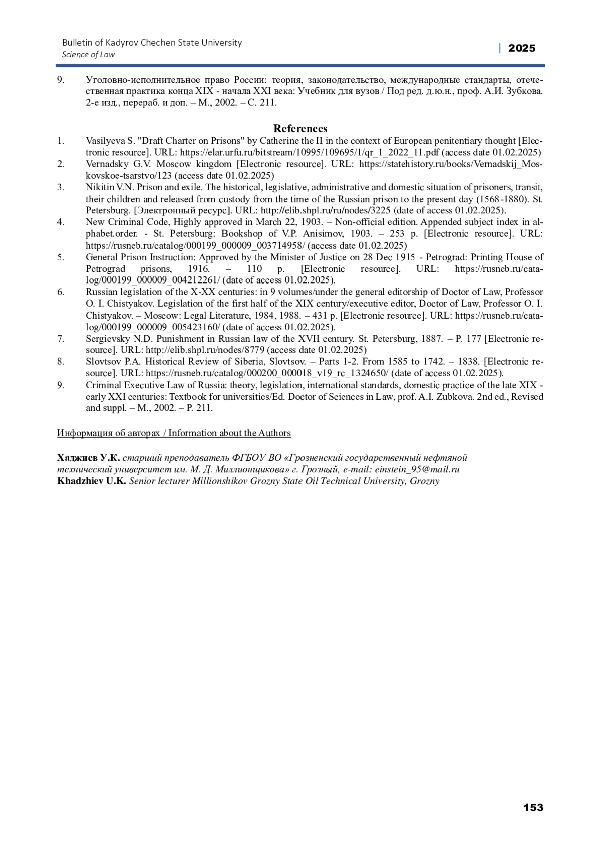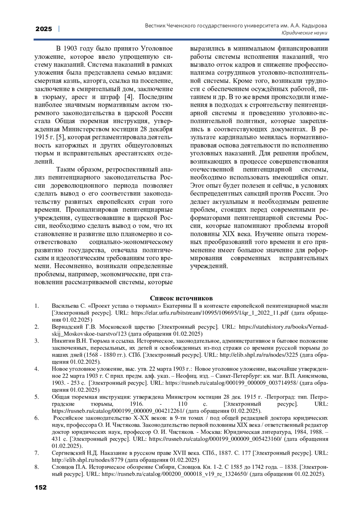 1. Васильева С. “Проект устава о тюрьмах” Екатерины II в контексте европейской пенитенциарной мысли [Электронный ресурс]. URL: https://elar.urfu.ru/bitstream/10995/109695/1/qr_1_2022_11.pdf (дата обращения 01.02.2025).