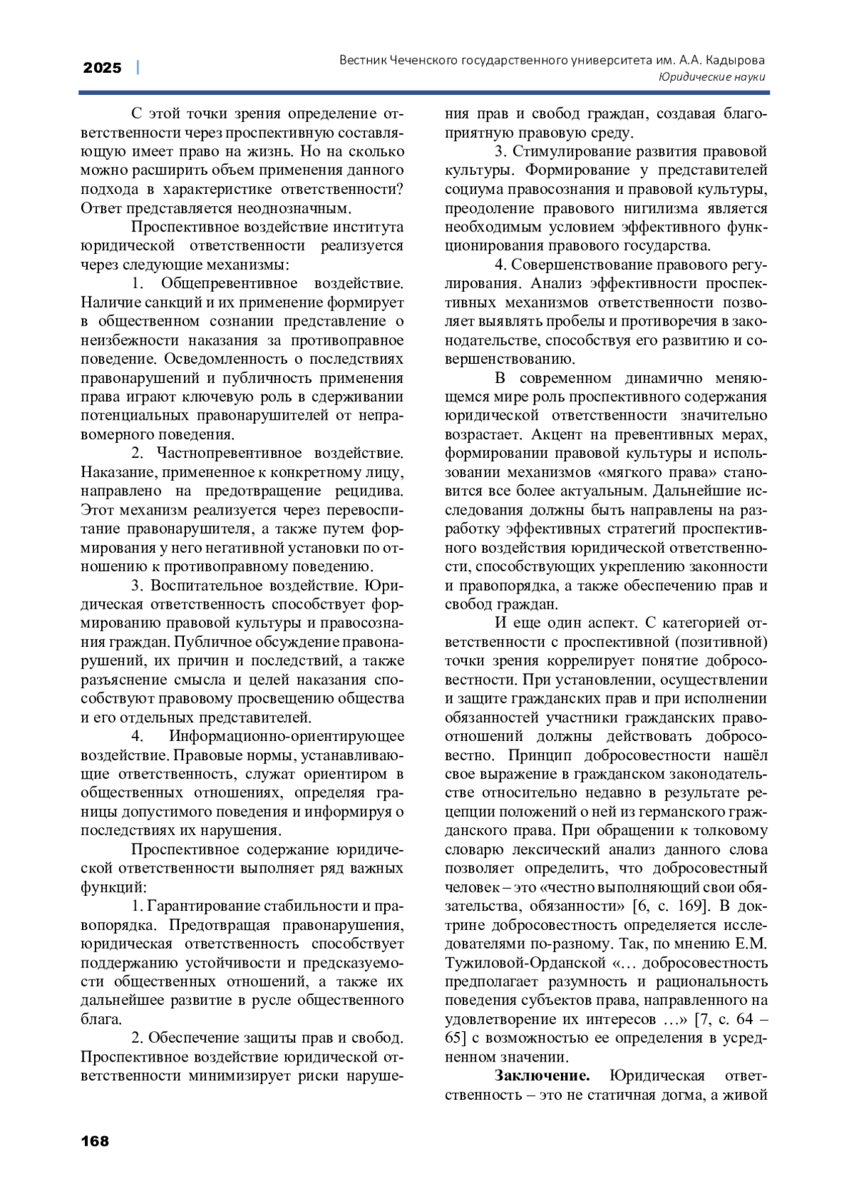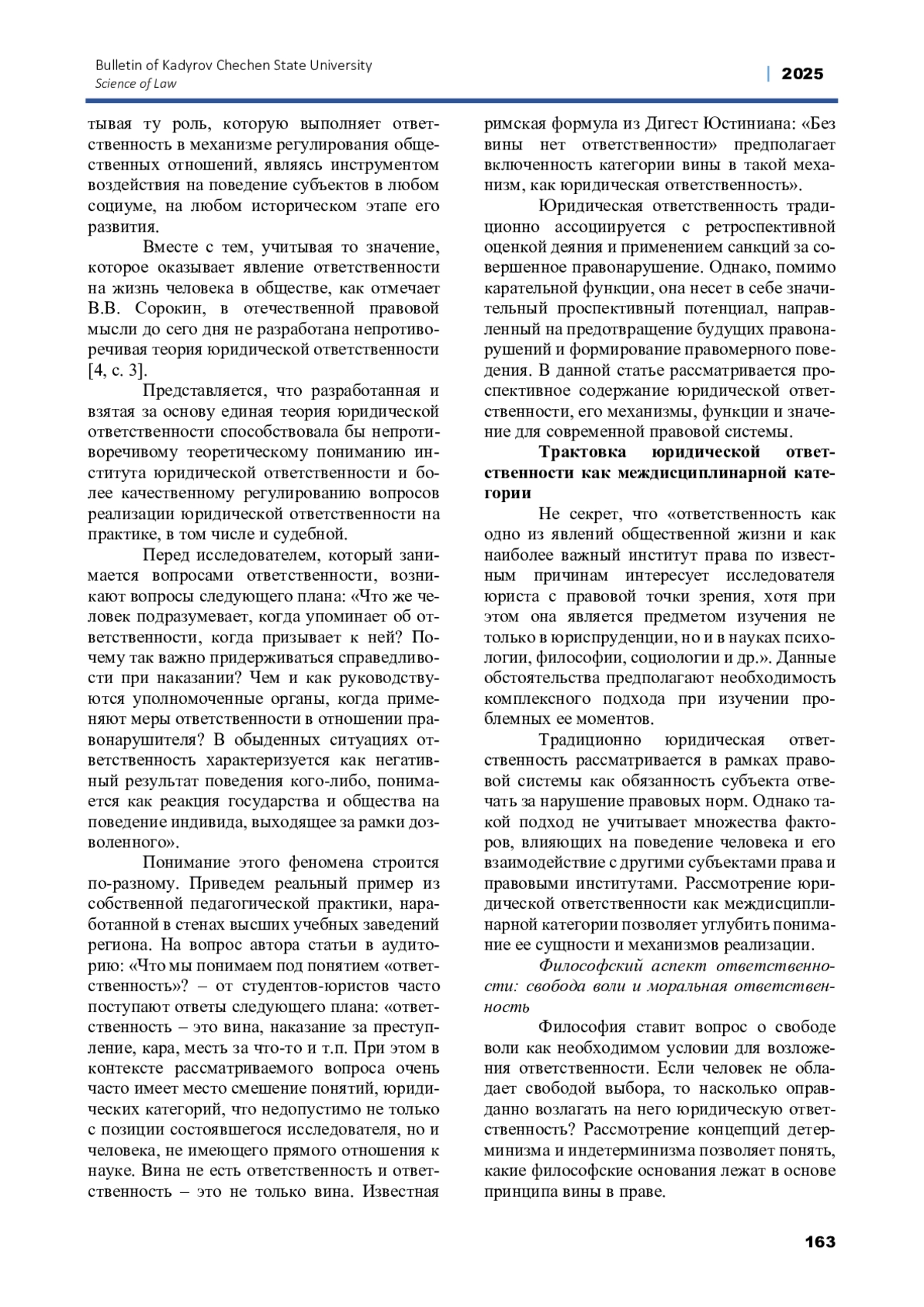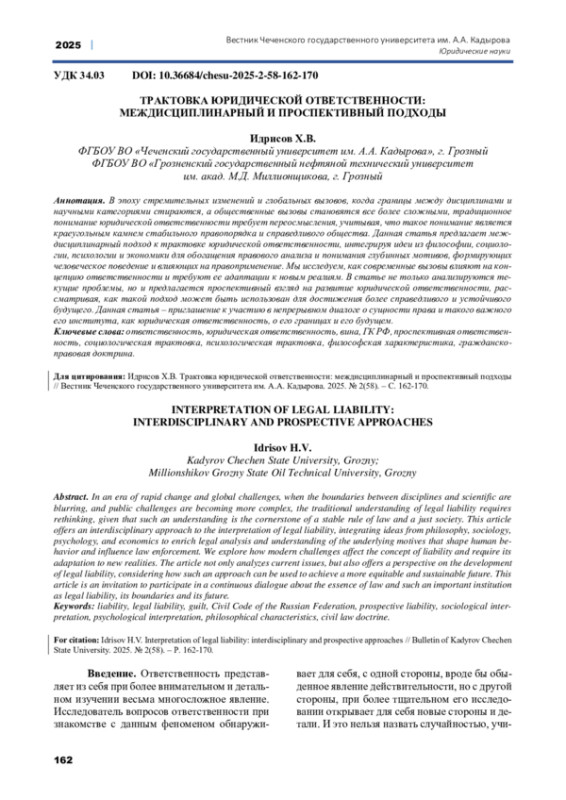 В эпоху стремительных изменений и глобальных вызовов, когда границы между дисциплинами и научными категориями стираются, а общественные вызовы становятся все более сложными, традиционное понимание юридической ответственности требует переосмысления, учитывая, что такое понимание является краеугольным камнем стабильного правопорядка и справедливого общества. Данная статья предлагает междисциплинарный подход к трактовке юридической ответственности, интегрируя идеи из философии, социологии, психологии и экономики для обогащения правового анализа и понимания глубинных мотивов, формирующих человеческое поведение и влияющих на правоприменение. Мы исследуем, как современные вызовы влияют на концепцию ответственности и требуют ее адаптации к новым реалиям. В статье не только анализируются текущие проблемы, но и предлагается проспективный взгляд на развитие юридической ответственности, рассматривая, как такой подход может быть использован для достижения более справедливого и устойчивого будущего. Данная статья - приглашение к участию в непрерывном диалоге о сущности права и такого важного его института, как юридическая ответственность, о его границах и его будущем.