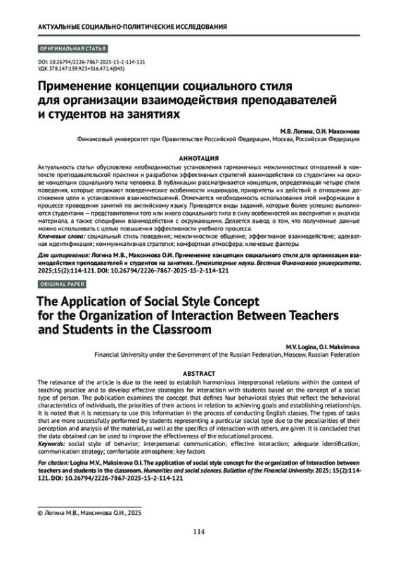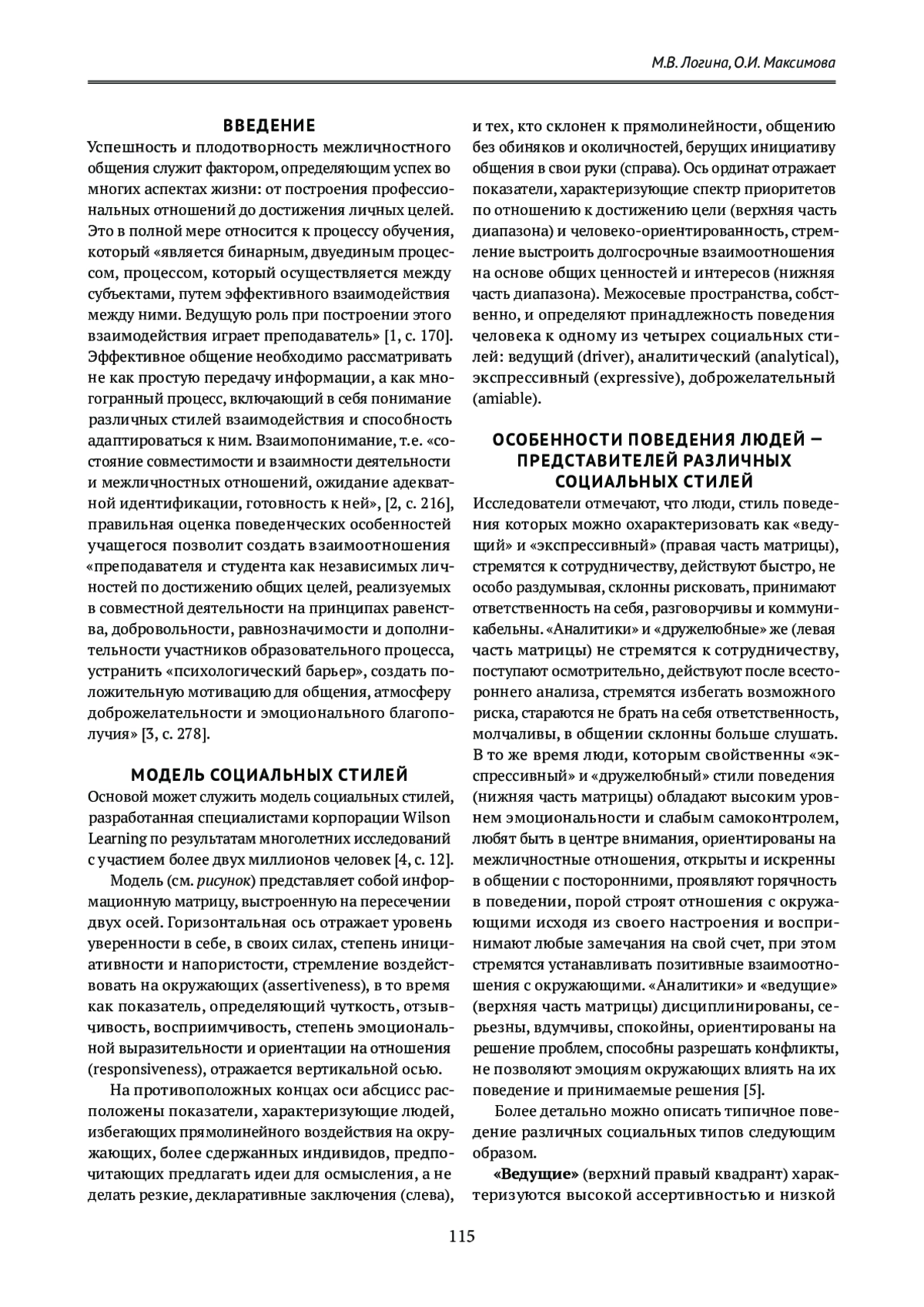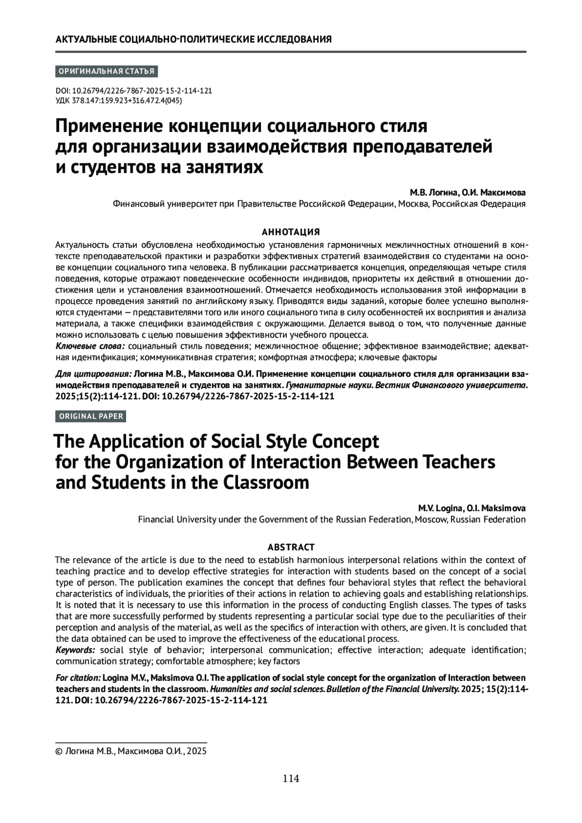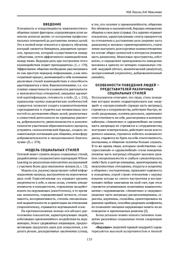 Актуальность статьи обусловлена необходимостью установления гармоничных межличностных отношений в контексте преподавательской практики и разработки эффективных стратегий взаимодействия со студентами на основе концепции социального типа человека. В публикации рассматривается концепция, определяющая четыре стиля поведения, которые отражают поведенческие особенности индивидов, приоритеты их действий в отношении достижения цели и установления взаимоотношений. Отмечается необходимость использования этой информации в процессе проведения занятий по английскому языку. Приводятся виды заданий, которые более успешно выполняются студентами — представителями того или иного социального типа в силу особенностей их восприятия и анализа материала, а также специфики взаимодействия с окружающими. Делается вывод о том, что полученные данные можно использовать с целью повышения эффективности учебного процесса.
