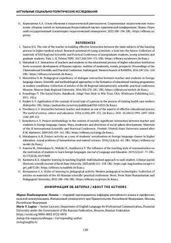 9. Ivanova M., Shlenskaya N., Mekeko N., Kashkarova T. The influence of the teaching style of communication on the motivation of students to learn foreign languages. Journal of Language and Education. 2019;5(2):67-77. URL: https://doi.org/10.17323/jle.2019.9695