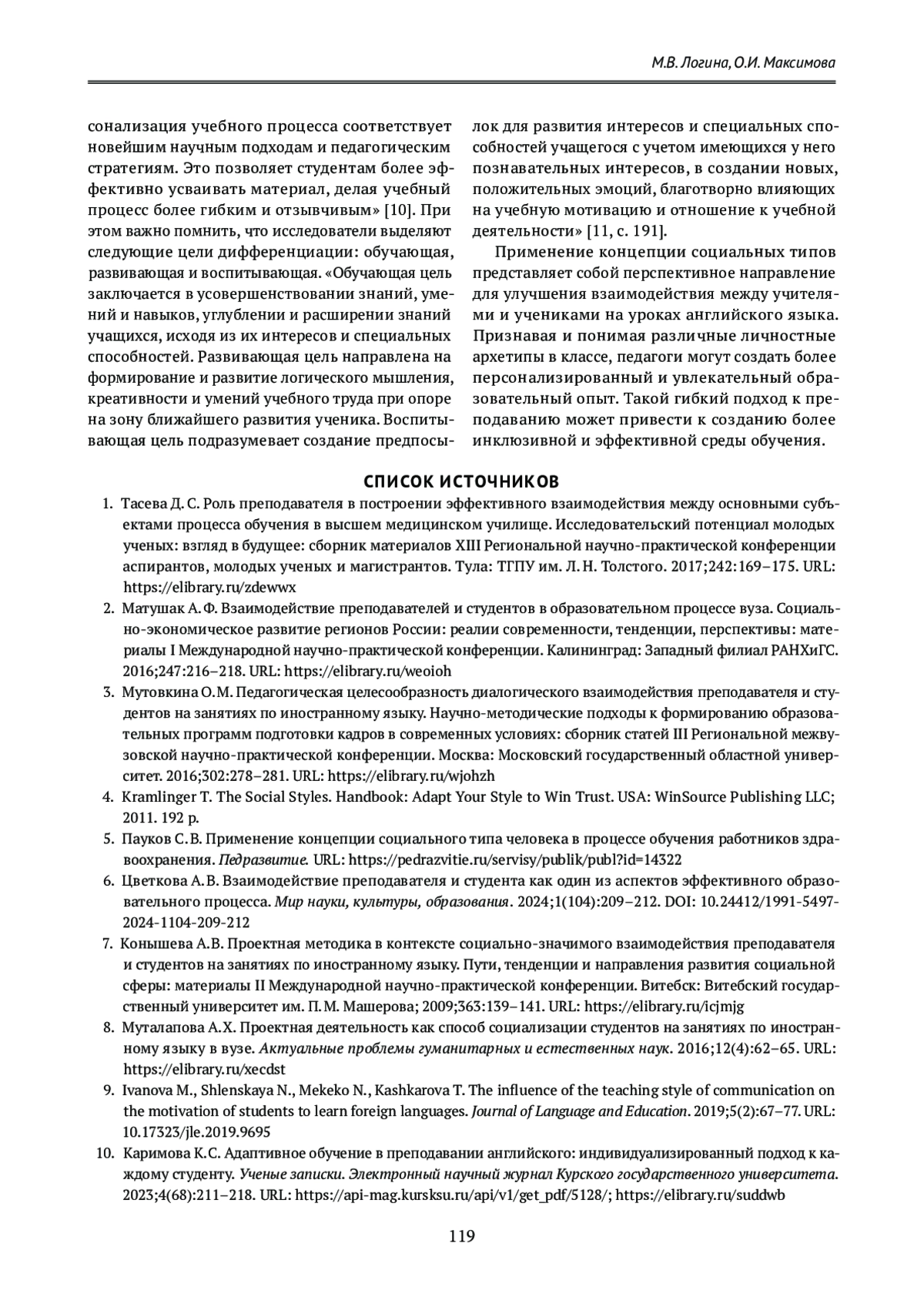 10. Каримова К.С. Адаптивное обучение в преподавании английского: индивидуализированный подход к каждому студенту. Ученые записки. Электронный научный журнал Курского государственного университета. 2023;4(68):211-218. URL: https://api-mag.kursksu.ru/api/v1/get_pdf/5128; https://elibrary.ru/suddwb