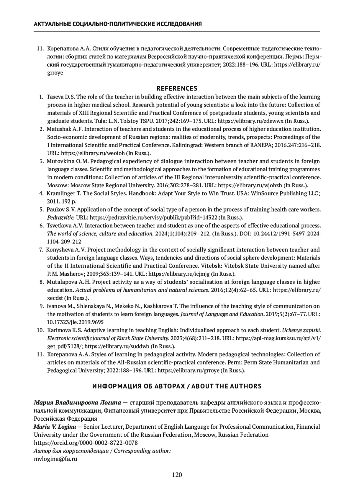 2. Матушак А.Ф. Взаимодействие преподавателей и студентов в образовательном процессе вуза. Социально-экономическое развитие регионов России: реалии современности, тенденции, перспективы: материалы I Международной научно-практической конференции. Калининград: Западный филиал РАНХиГС. 2016;247:216-218. URL: https://elibrary.ru/weoioh