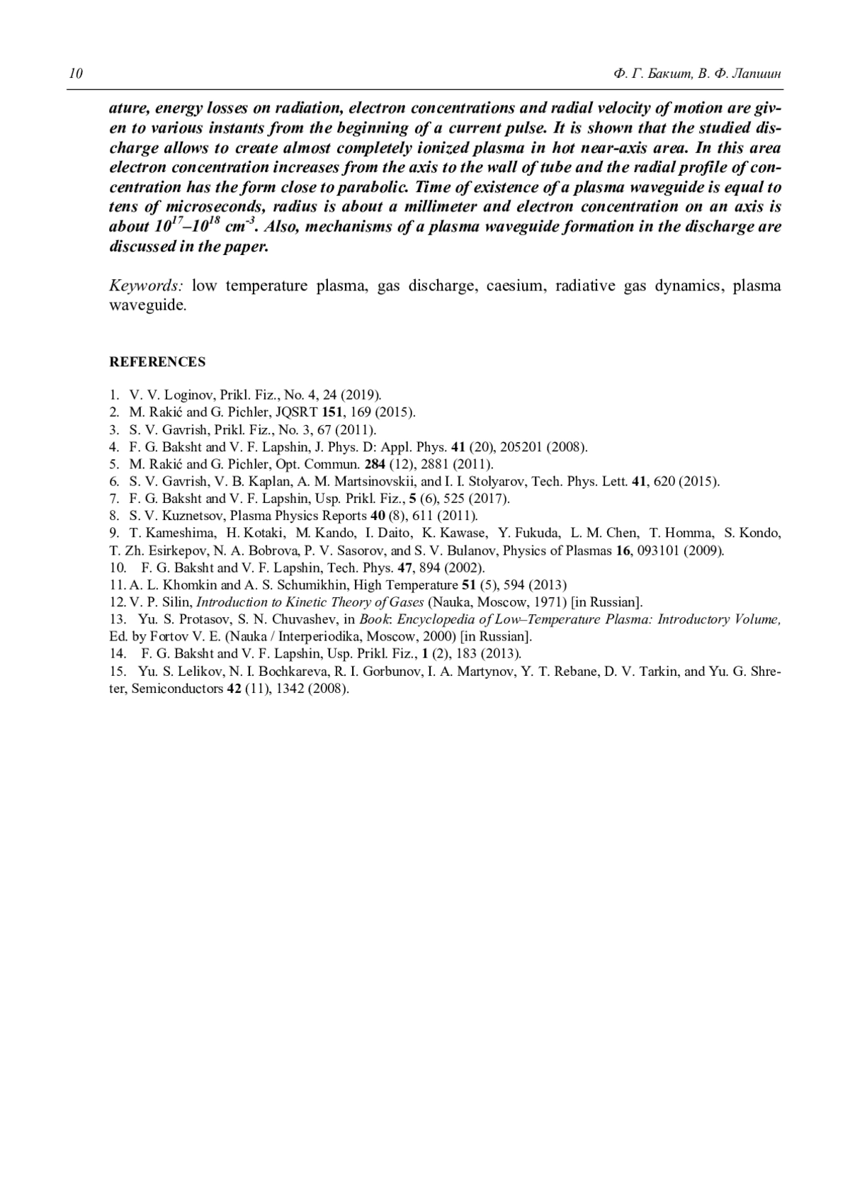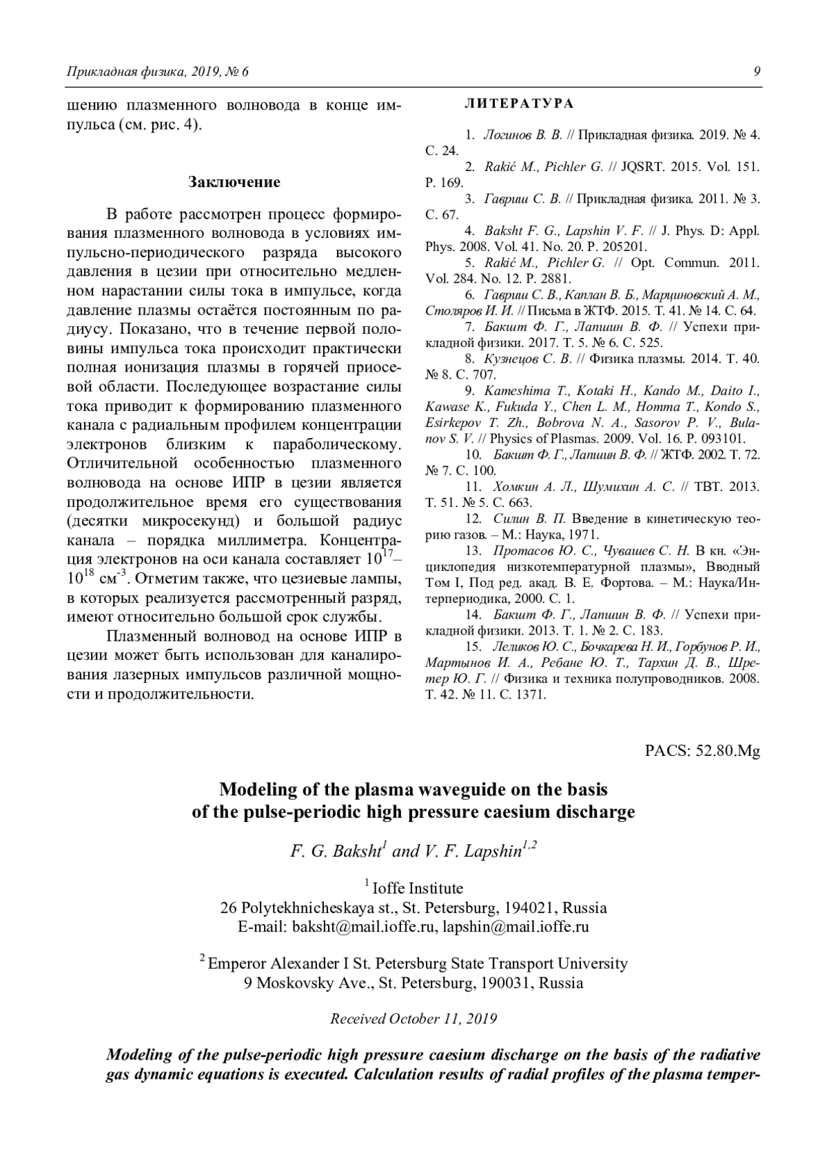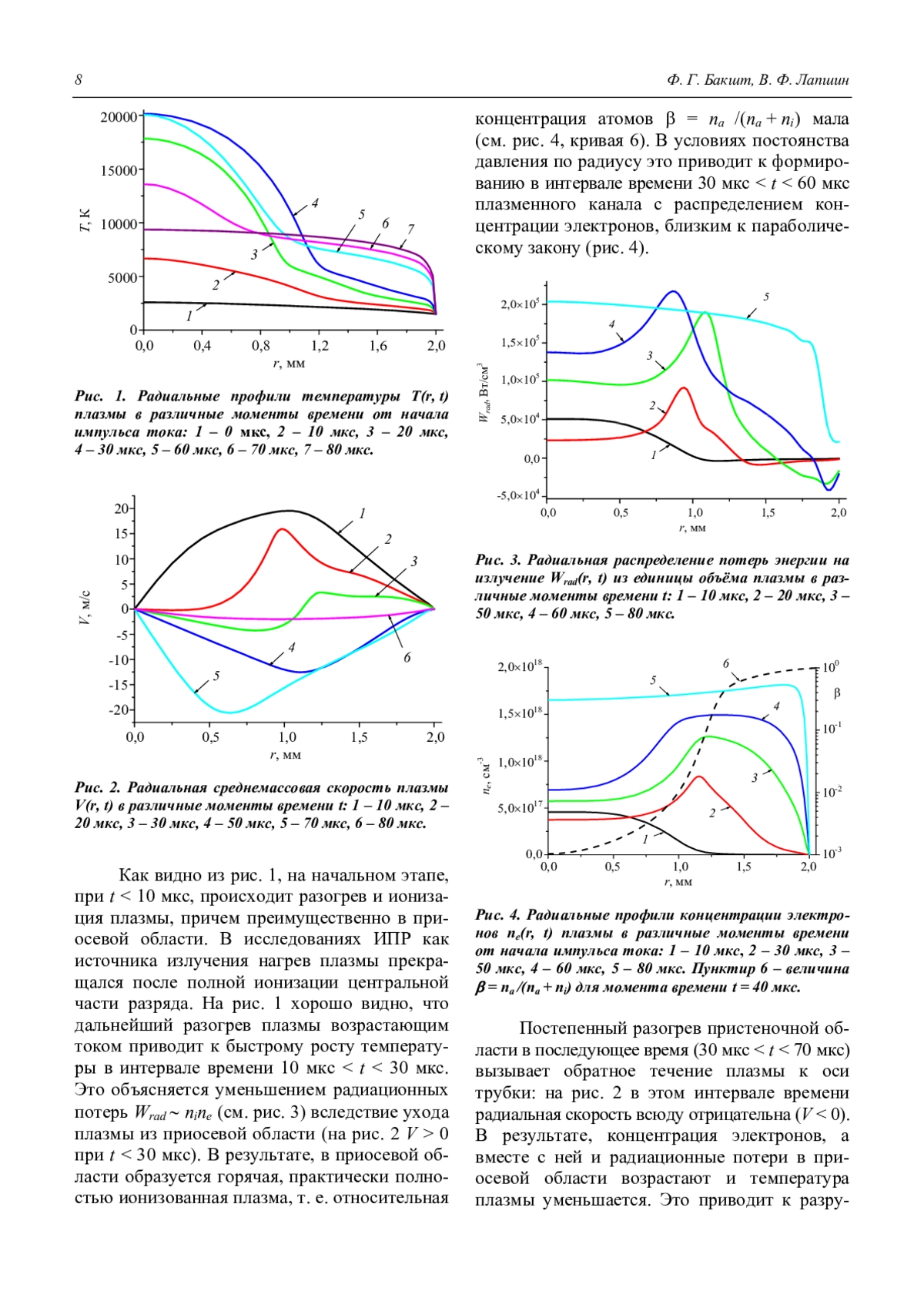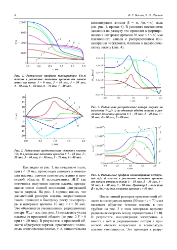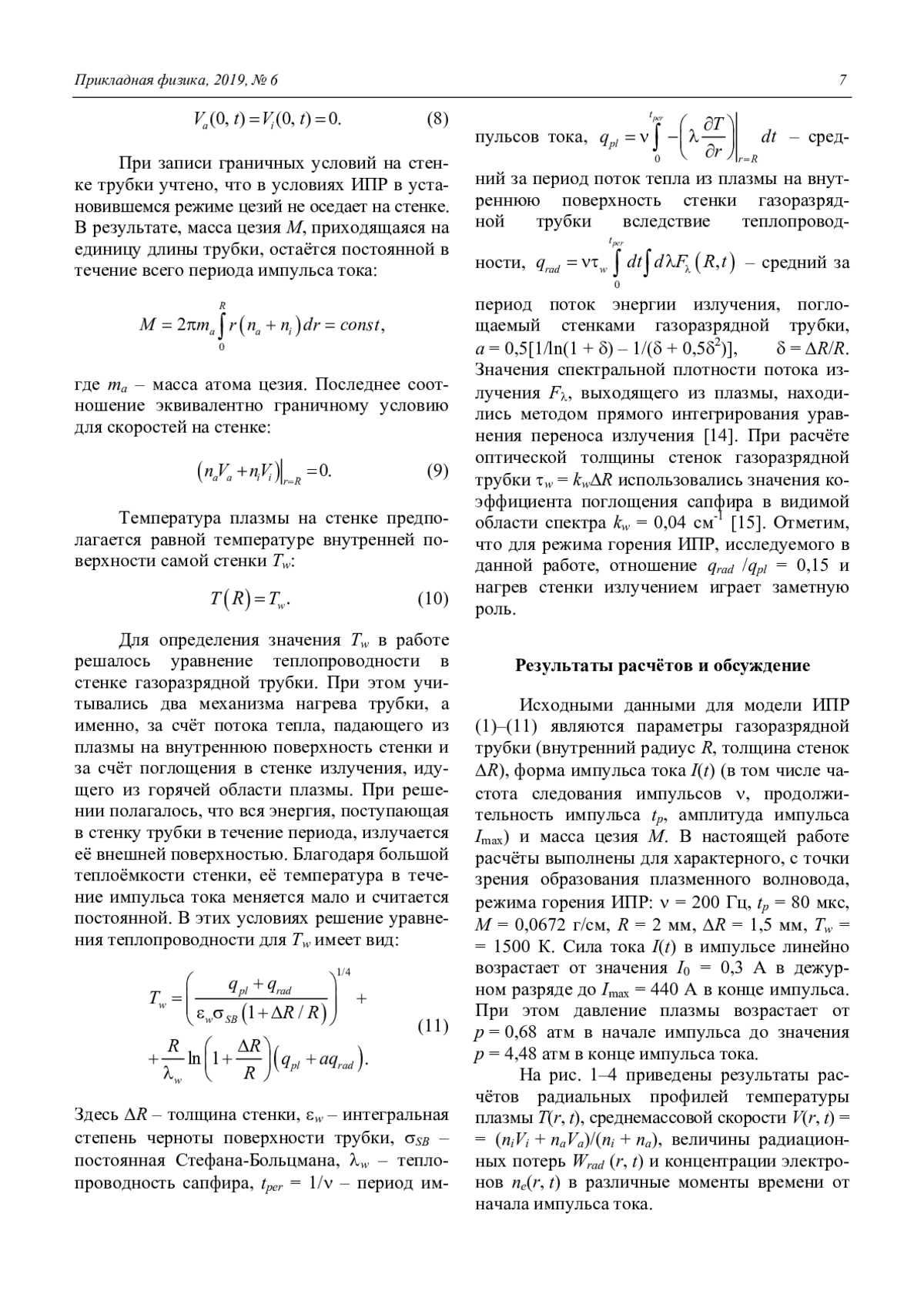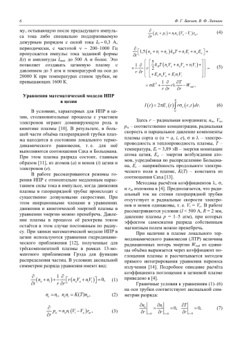 Выполнено моделирование импульсно-периодического разряда высокого давления в цезии на основе уравнений радиационной газодинамики. Приведены результаты расчё- тов радиальных профилей температуры плазмы, среднемассовой скорости, потерь энергии на излучение и концентраций электронов в различные моменты времени от начала импульса тока. Показано, что исследуемый разряд позволяет создавать в горячей приосевой области практически полностью ионизованную плазму, в которой концентрация электронов возрастает от оси к стенкам трубки и имеет радиальный профиль, близкий к параболическому. Время существования плазменного волновода радиусом порядка миллиметра составляет десятки микросекунд, концентрация электронов на оси порядка 1017–1018 см-3. Обсуждаются механизмы формирования плазменного волновода в разряде.