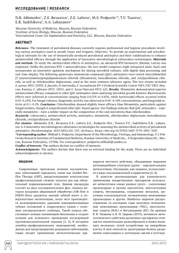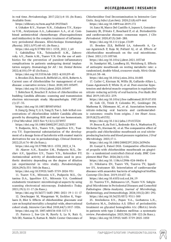 10. Акавов АН, Расулов ИМ, Подпорин МС, Дешев АВ, Ипполитов ЕВ, Царев ВН, Колесников ПЮ. Антимикробная активность дезинфектантов, применяемых в ортопедической стоматологии в зависимости от степени разведения (экспериментальное исследование in vitro). Пародонтология. 2024;29(3):331-340. DOI: 10.33925/1683-3759-2024-931