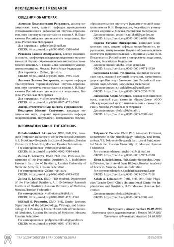 22. Царева ТВ, Балмасова ИП, Царев ВН. Поддесневой микробиом при заболеваниях пародонта и коморбидной патологии (метаанализ). Журнал микробиологии, эпидемиологии и иммунобиологии. 2024;101(2):281-292. DOI: 10.36233/0372-9311-500