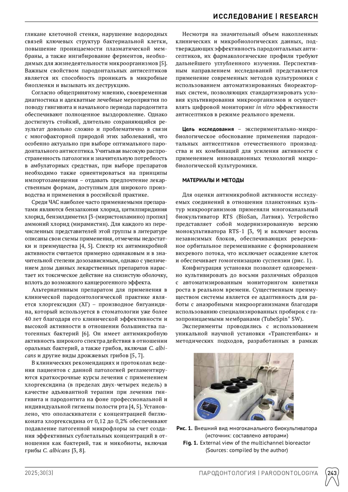 Актуальность. Лечение воспалительных заболеваний пародонта в настоящее время предполагает обязательное проведение профессиональной гигиены полости рта с применением различных антисептиков в виде ополаскивателей и ирригатантов. Цель. Экспериментально-микробиологическое обоснование применения пародонтальных антисептиков отечественного производства и их комбинаций для усиления активности с применением инновационных технологий микробиологической культуромики. Материалы и методы. Для исследования влияния антисептиков был использован усовершенствованный биореактор RTS (BioSan, Латвия). В отличие от предыдущей версии прибора (монокультиватора RTS-1), новая модель представляет собой единый комплект из восьми блоков. В каждом блоке реализован инновационный принцип перемешивания микробной культуры с последующей цифровой обработкой данных и выводом результатов на монитор. В исследовании были использованы антисептические препараты из группы ЧАС: бензилдиметил [3-(миристоиламино) пропил] аммоний хлорид (мирамистин), бензалкония хлорид и цитилпиридиния хлорид, а также хлоргексидина биглюконат в качестве наиболее распространенного препарата для сравнения. В качестве тест-штаммов применяли: S. aureus АТСС 25993; E. faecalis; P. intermedia; F. necroforum 89-5 ФГБНУ ФНЦ ВИЭВ РАН; C. albicans АТСС 10231; C. krusei Harvard ATCC 625. Результаты. Мирамистин продемонстрировал превосходящую антимикробную эффективность в сравнении с другими антисептиками группы ЧАС при анализе кинетики роста микробных популяций. Для достижения бактериостатического эффекта требовались концентрации от 0,012 до 0,05%, тогда как бактерицидное действие проявлялось в пределах 0,05-0,10%. Для грибковых культур фунгистатическая активность регистрировалась для 0,05-0,10% растворов, а фунгицидная – для 0,1-0,2%. Заключение. Хлоргексидин незначительно отличался от показателей мирамистина, уступая ему по противогрибковой активности, но превосходил другие исследуемые ЧАС. Представленные в настоящем исследовании данные позволяют говорить о более мягком действии ЧАС, в частности мирамистина, на состав орального микробиоценоза по сравнению с х лоргексидином.