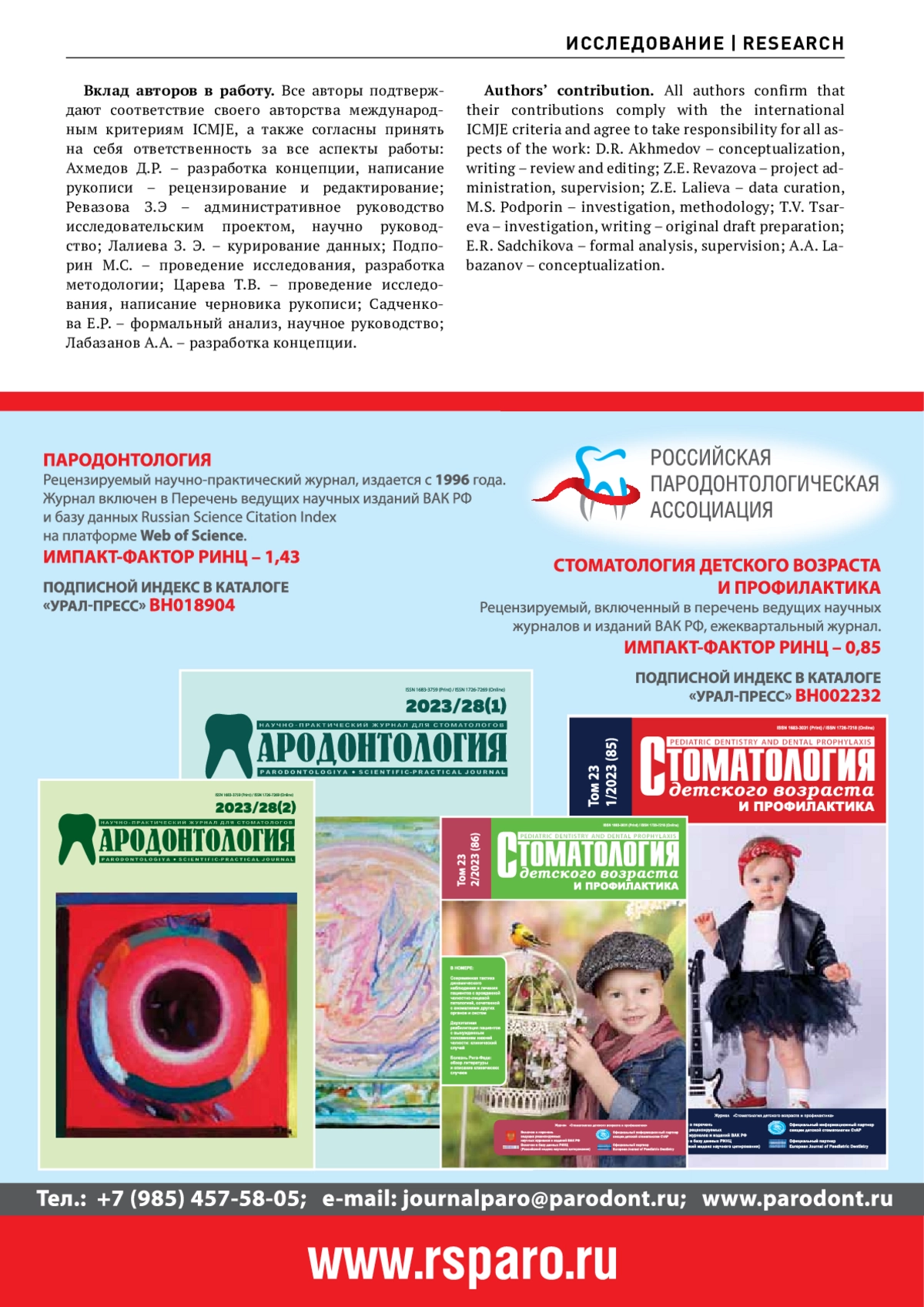 23. Стрельникова ЕВ, Попов ВА, Горбатова ЛН, Горбатова МА, Дубинина АС. Влияние лечения пародонтита на уровень гликированного гемоглобина A1c (HbA1c) при сопутствующем сахарном диабете 2 типа: систематический обзор. Пародонтология. 2025;30(2):108-122.