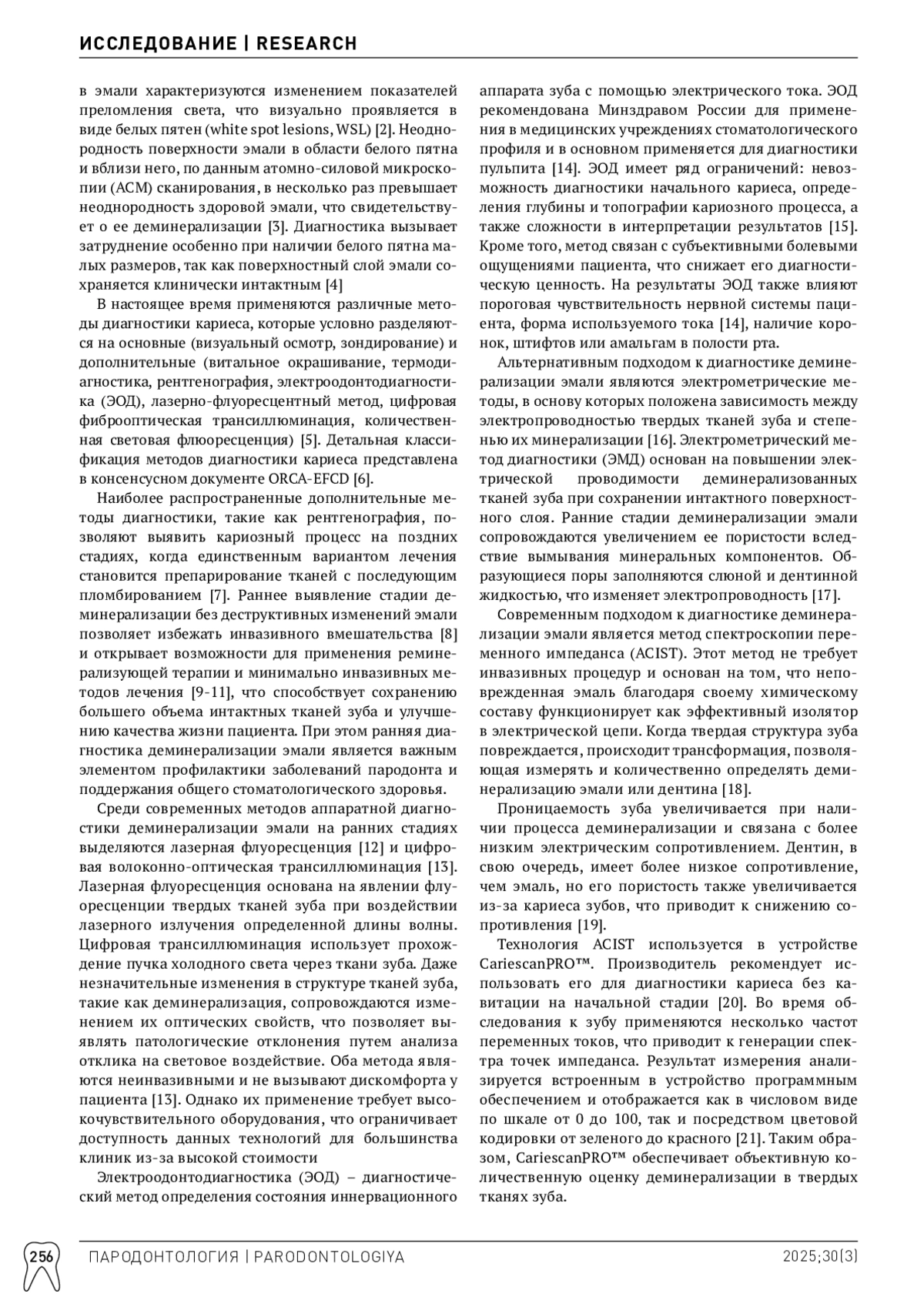 16. Иванова ГГ, Жорова ТН. Исследование среднестатистического показателя электропроводности твердых тканей зубов с момента их прорезывания в динамике с целью диагностики патологических процессов зубов с незаконченной минерализацией эмали. Институт стоматологии. 2020;88(3):87-90. Режим доступа: item.asp?id=44076261.