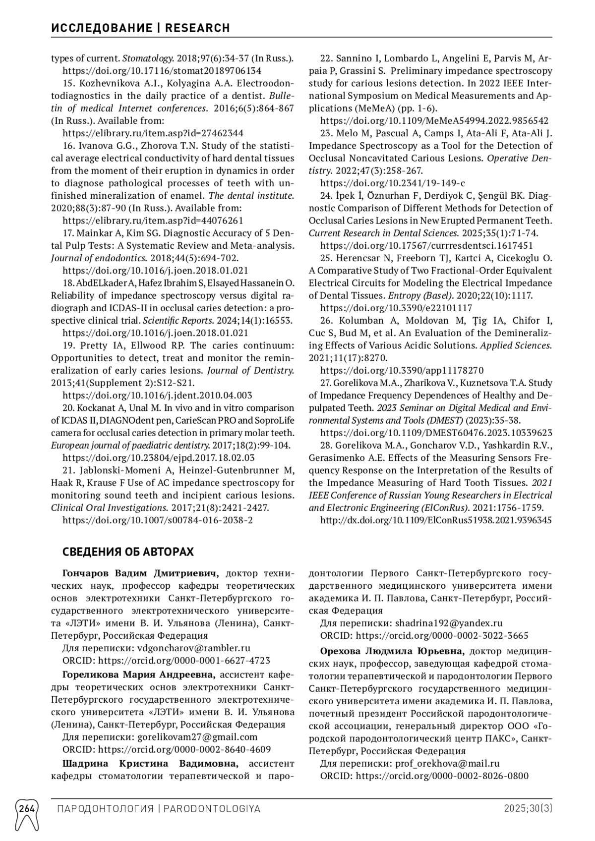 28. Gorelikova MA, Goncharov VD, Yashkardin RV, Gerasimenko AE. Effects of the Measuring Sensors Frequency Response on the Interpretation of the Results of the Impedance Measuring of Hard Tooth Tissues. 2021 IEEE Conference of Russian Young Researchers in Electrical and Electronic Engineering (ElConRus). 2021:1756-1759.