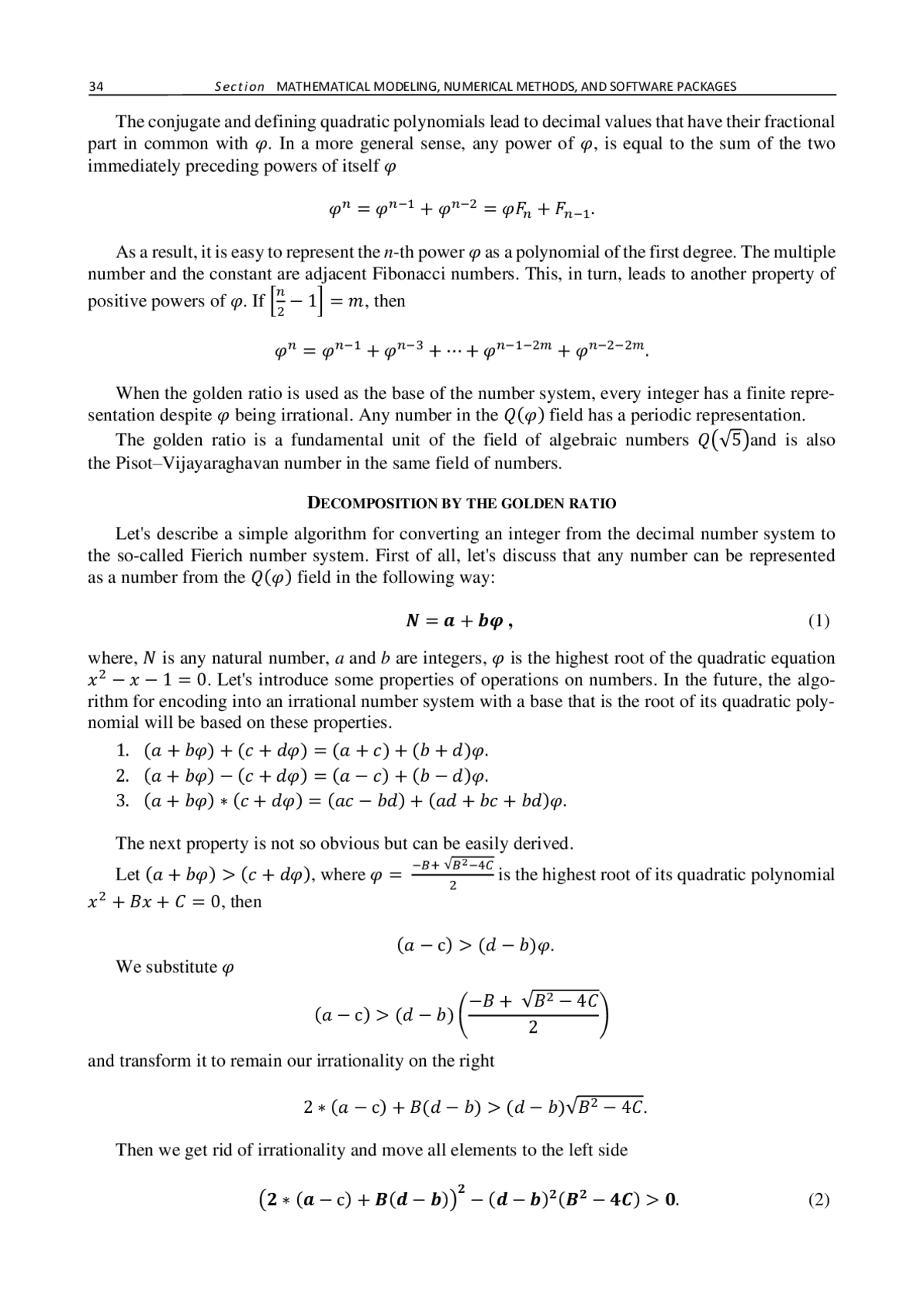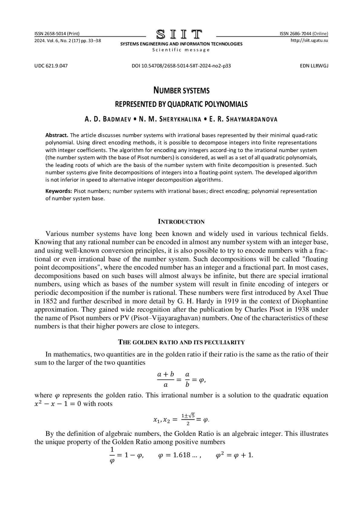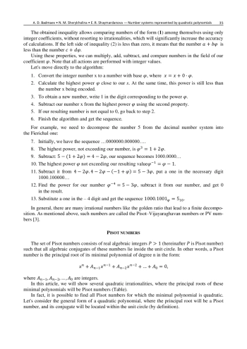 Рассматриваются системы счисления с иррациональным основанием, представимые своим минимальным квадратичным полиномом. Используя методы прямого кодирования, можно раскладывать целые числа в конечные представления с целыми коэффициентами. Рассмотрен алгоритм кодирования любых целых чисел по иррациональной системе счисления (система счисления с основанием чисел Пизо), а также представлено множество всех квадратичных полиномов, старшие корни которых являются основанием системы счисления с конечными разложениями. Такие системы счисления дают конечные разложения целых чисел в систему счисления с плавающей точкой. Разработанный алгоритм не уступает по скорости работы с альтернативными алгоритмами разложения по целочисленным системам счисления.