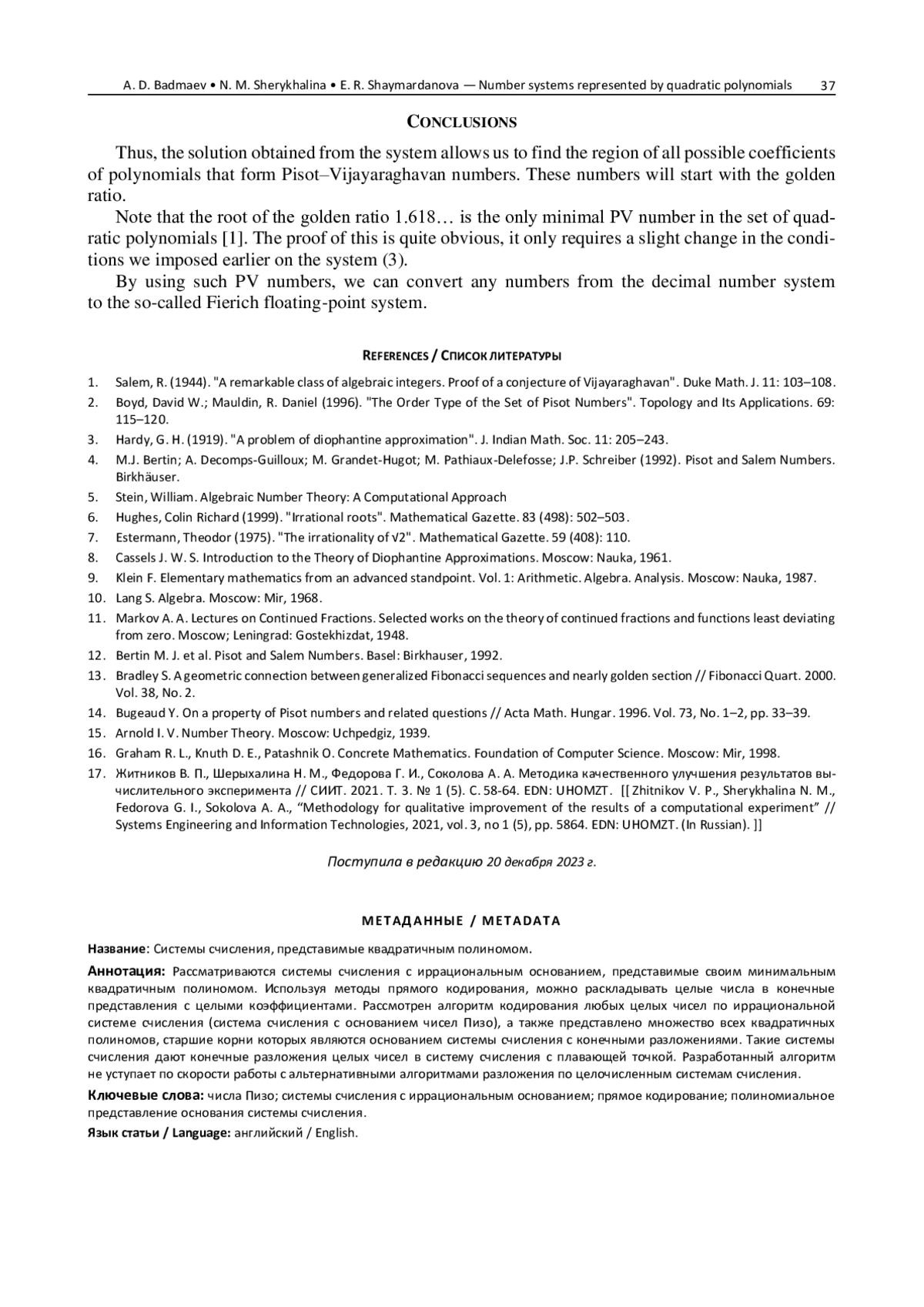 - Bertin M. J. et al. Pisot and Salem Numbers. Basel: Birkhauser, 1992.