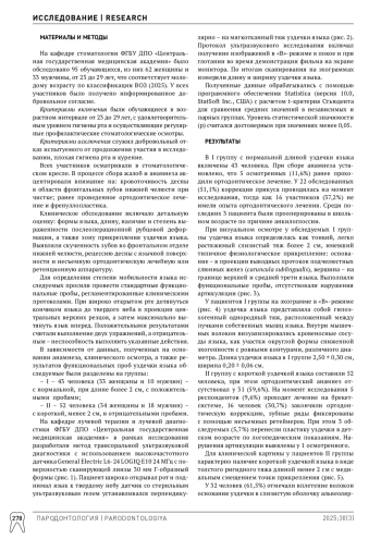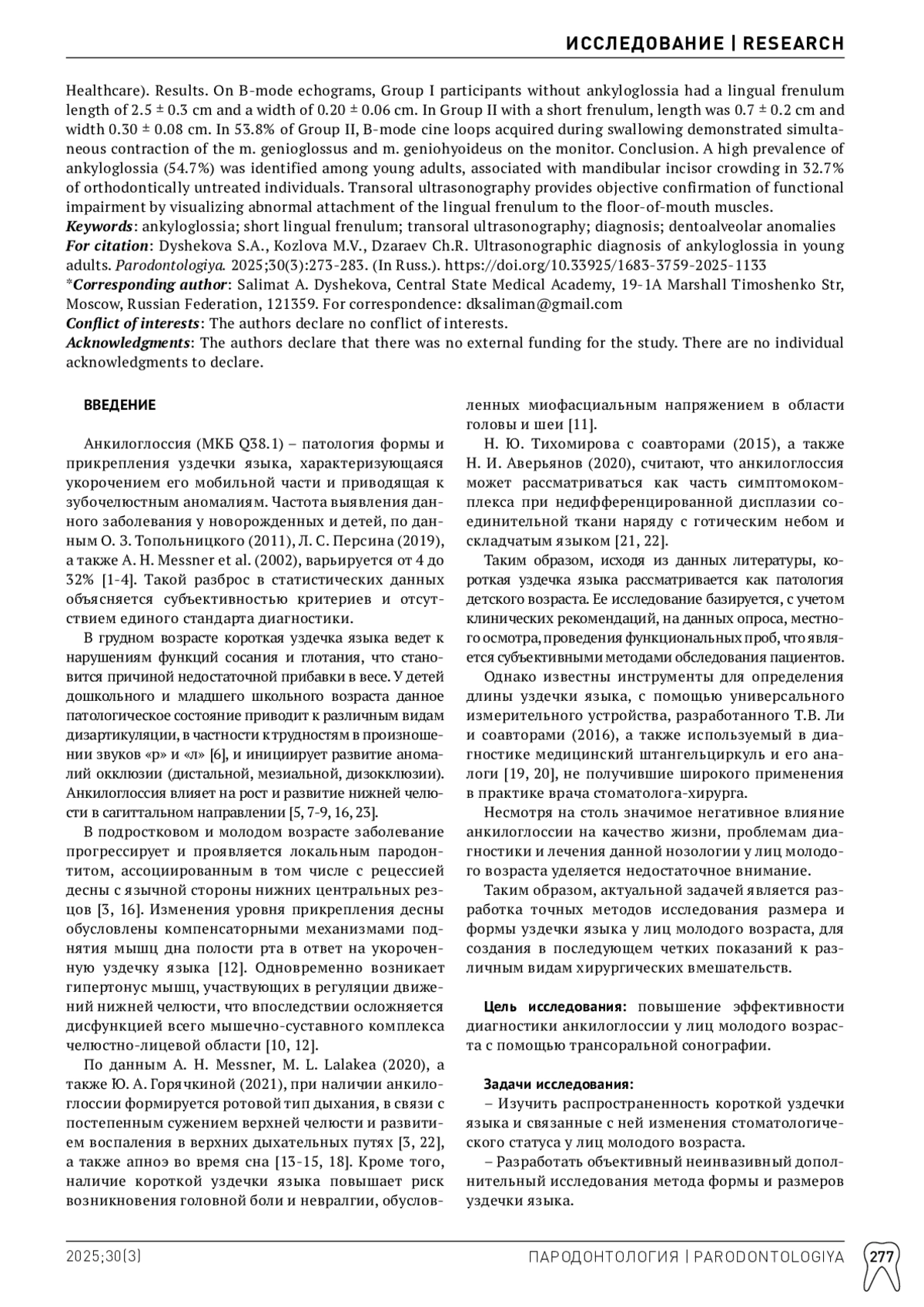 Актуальность. Анкилоглоссия (МКБ Q38.1) – патология формы и прикрепления уздечки языка, характеризующаяся укорочением его мобильной части и приводящая к зубочелюстным аномалиям. Отсутствие объективных методов диагностики затрудняет выбор тактики лечения и увеличивает риск осложнений. Имеющиеся статистические данные и критерии диагностики сформированы исключительно на основе исследований у детей, в то время как их распространенность и клиническая значимость у пациентов молодого возраста мало изученными. Цель. Повышение эффективности диагностики анкилоглоссии у лиц молодого возраста с помощью трансоральной сонографии. Материалы и методы. Обследовано 95 пациентов (23–29 лет), разделенных на две группы: с нормальной (n = 43) и короткой (n = 52) уздечкой языка. Разработан трансоральный ультразвуковой метод исследования длины и ширины уздечки языка с использованием высокочастотного датчика General Electric L6-24 LOGIQ E10 24 МГц. Результаты. На эхограммах в режиме «В» у обследуемых из I группы без анкилоглосии длина уздечки языка составила 2,5 ± 0,3 см, ширина 0,20 ± 0,06 см. Во II группе с короткой уздечкой языка – длина 0,7 ± 0,2 см, а ширина 0,30 ± 0,08 см. При этом обнаружено, что в 53,8% случаев у исследуемых из II группы «В» режиме и демонстрации фильма при глотании в динамике на экране монитора визуализировалось одномоментное сокращение m. genioglossus и m. geniohyoideus. Заключение. У лиц молодого возраста выявлена высокая распространенность анкилоглоссии (54,7% случаев), ассоциированная со скученностью нижних резцов у 32,7% нелеченных ортодонтически обследуемых. Трансоральная сонография объективно подтверждает функциональные нарушения, визуализируя аномальное прикрепление уздечки к мышцам дна полости рта.