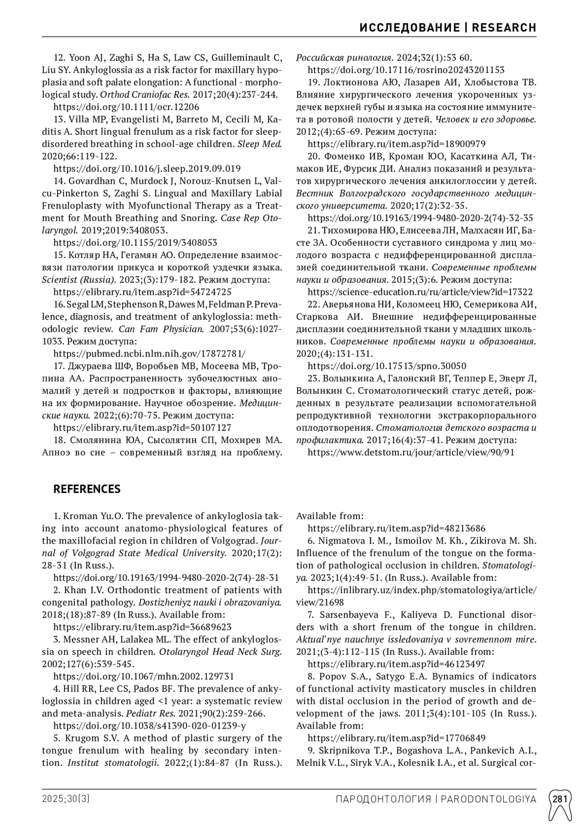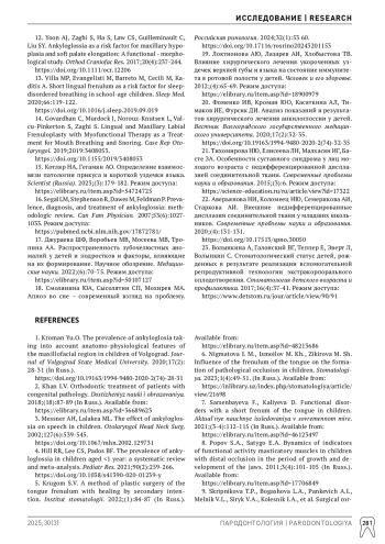 1. Кроман Ю.О. Распространенность анкилоглоссии с учетом анатомо-физиологических особенностей челюстно-лицевой области у детей Волгограда. Вестник ВолГМУ. 2020;17(2):28-31. DOI: 10.19163/1994-9480-2020-2(74)-28-31