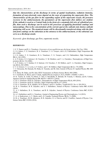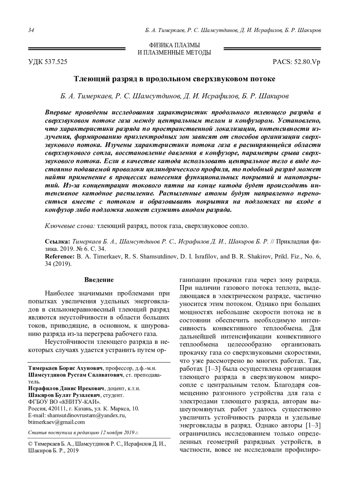 ТИМЕРКАЕВ Б. А., ШАМСУТДИНОВ Р. С., ИСРАФИЛОВ Д. И., ШАКИРОВ Б. Р. ТЛЕЮЩИЙ РАЗРЯД В ПРОДОЛЬНОМ СВЕРХЗВУКОВОМ ПОТОКЕ // ПРИКЛАДНАЯ ФИЗИКА. 2019. №6