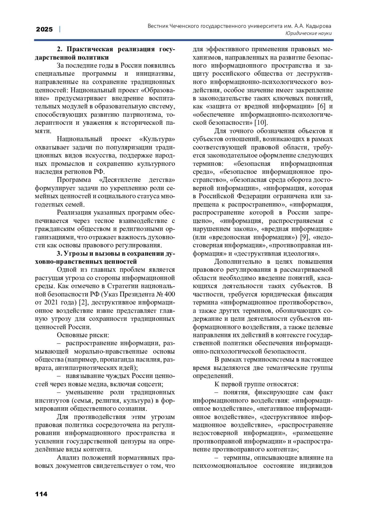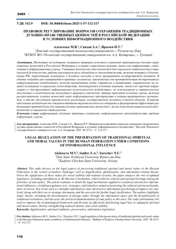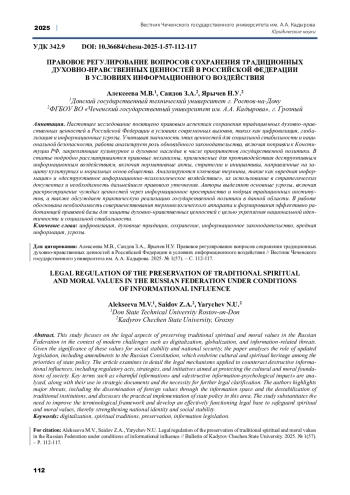 Настоящее исследование посвящено правовым аспектам сохранения традиционных духовно-нравственных ценностей в Российской Федерации в условиях современных вызовов, таких как цифровизация, глобализация и информационные угрозы. Учитывая значимость этих ценностей для социальной стабильности и национальной безопасности, работа анализирует роль обновлённого законодательства, включая поправки к Конституции РФ, закрепляющие культурное и духовное наследие в числе приоритетов государственной политики. В статье подробно рассматриваются правовые механизмы, применяемые для противодействия деструктивным информационным воздействиям, включая нормативные акты, стратегии и инициативы, направленные на защиту культурных и моральных основ общества. Анализируются ключевые термины, такие как «вредная информация» и «деструктивное информационно-психологическое воздействие», их использование в стратегических документах и необходимость дальнейшего правового уточнения. Авторы выделяют основные угрозы, включая распространение чуждых ценностей через информационное пространство и подрыв традиционных институтов, а также обсуждает практическую реализацию государственной политики в данной области. В работе обоснована необходимость совершенствования терминологического аппарата и формирования эффективно работающей правовой базы для защиты духовно-нравственных ценностей с целью укрепления национальной идентичности и социальной стабильности.