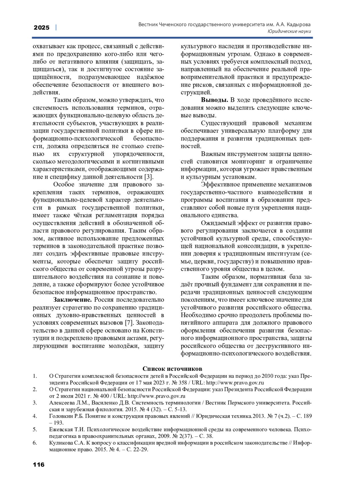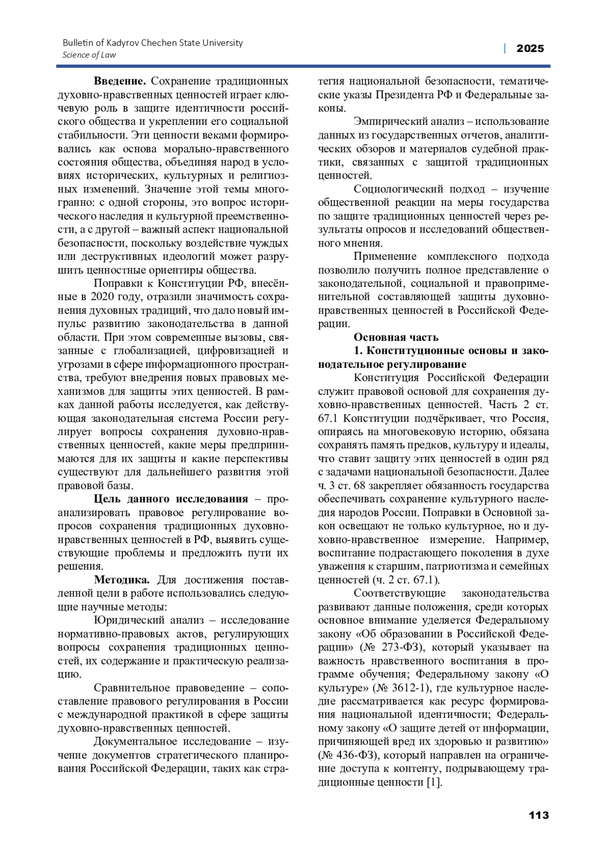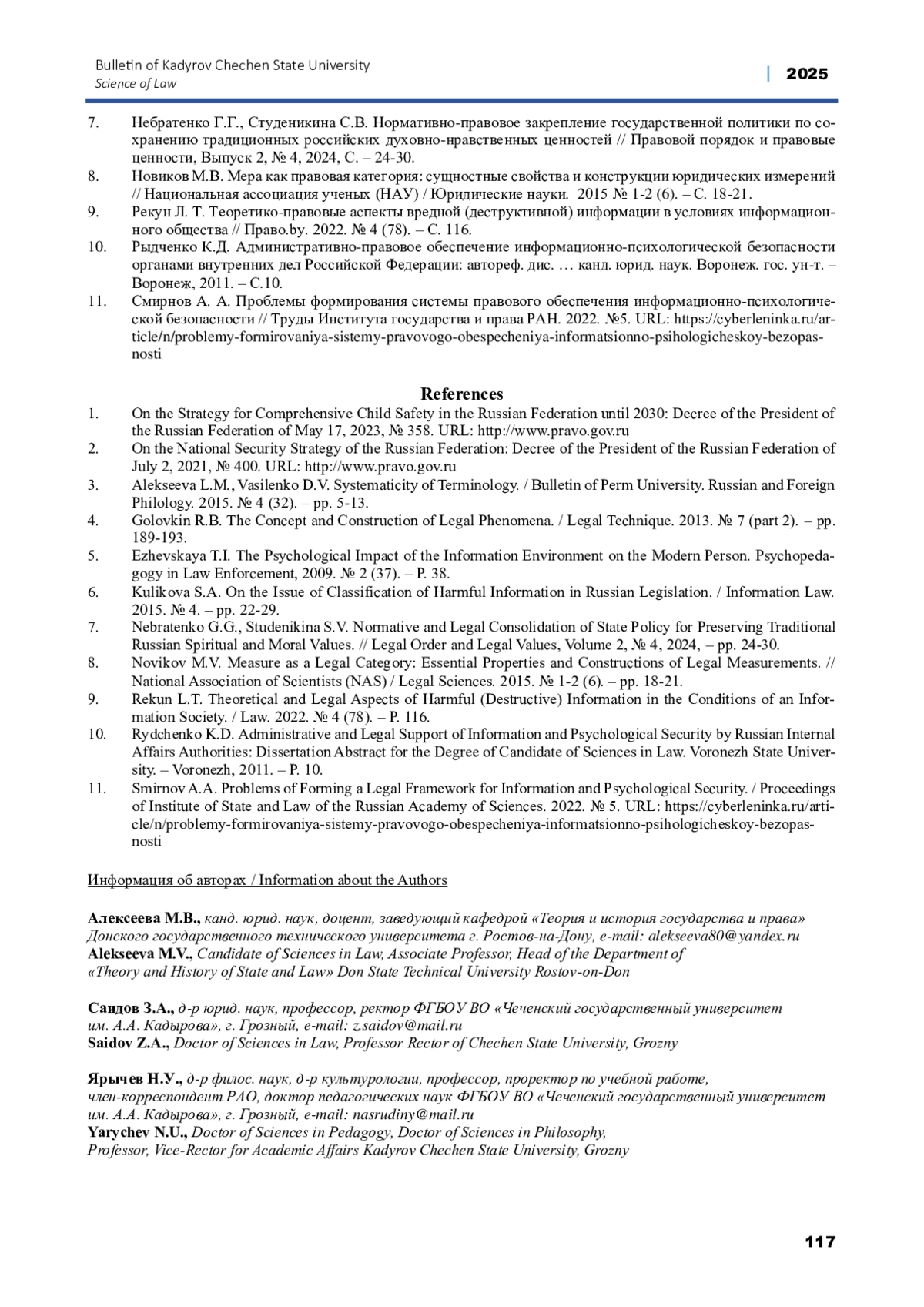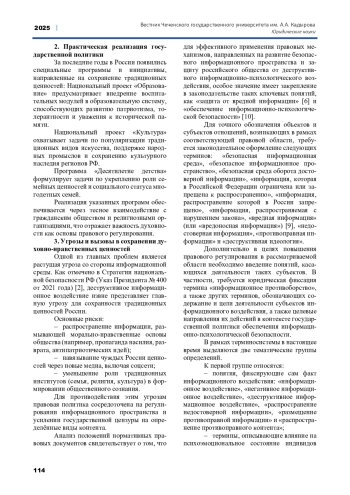 7. Небратенко Г.Г., Студеникина С.В. Нормативно-правовое закрепление государственной политики по сохранению традиционных российских духовно-нравственных ценностей // Правовой порядок и правовые ценности, Выпуск 2, № 4, 2024, С. - 24-30. EDN: ZRABZH
