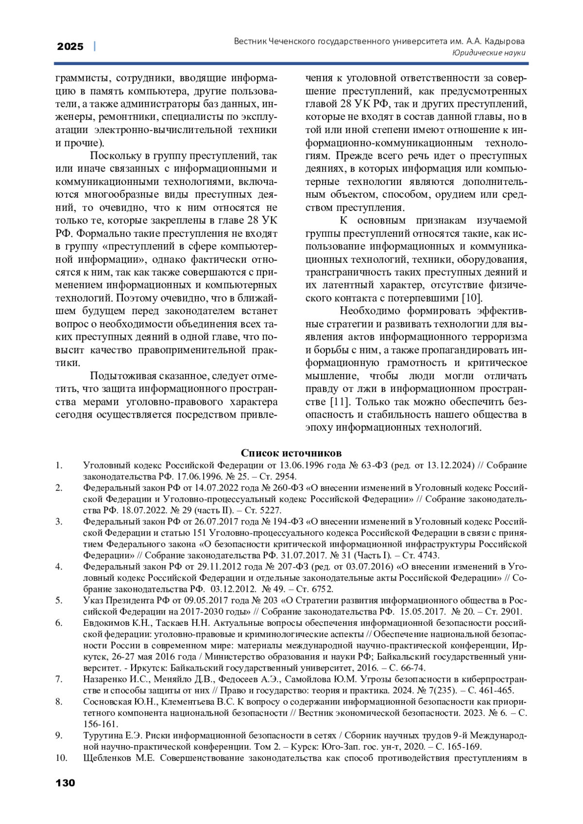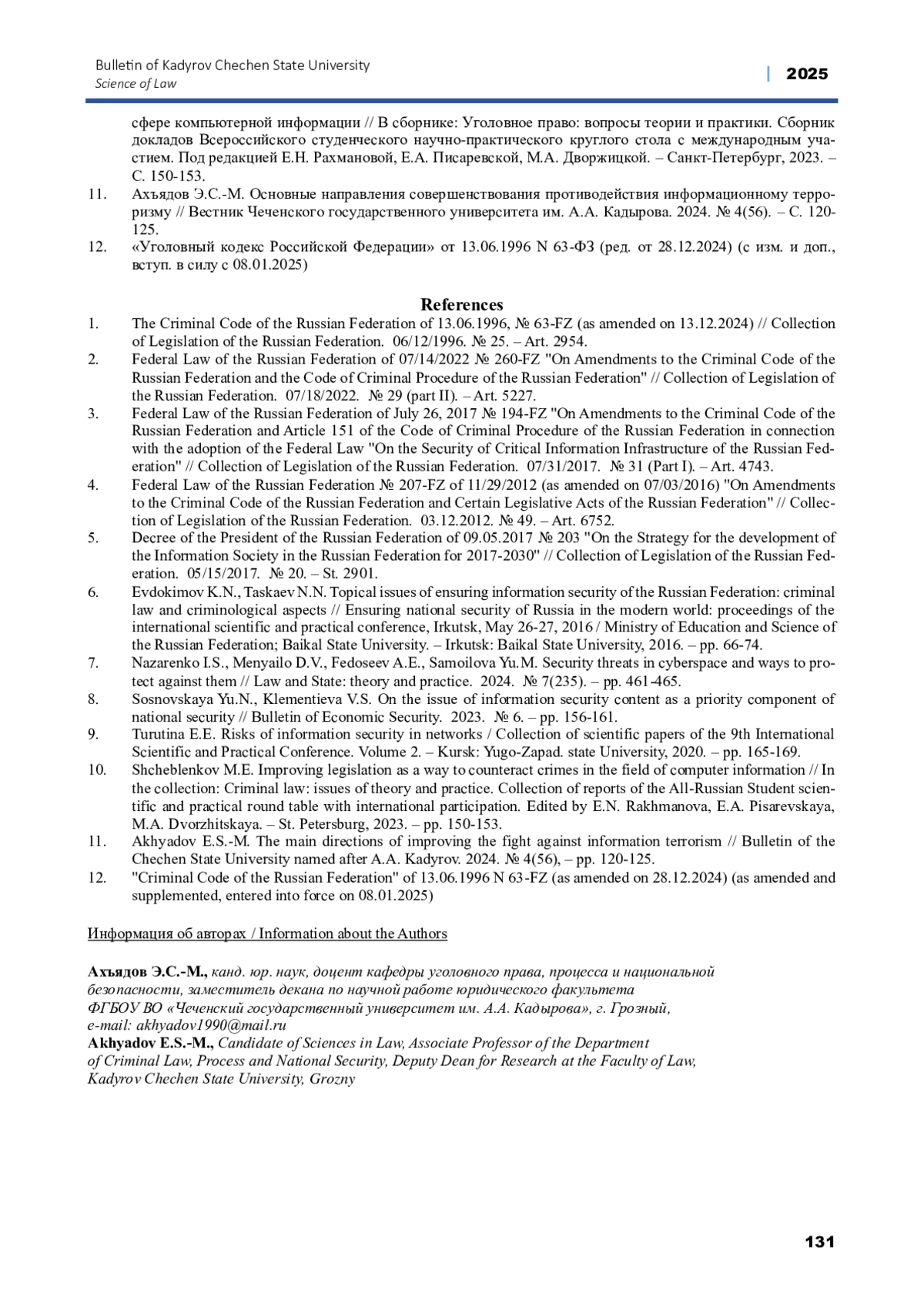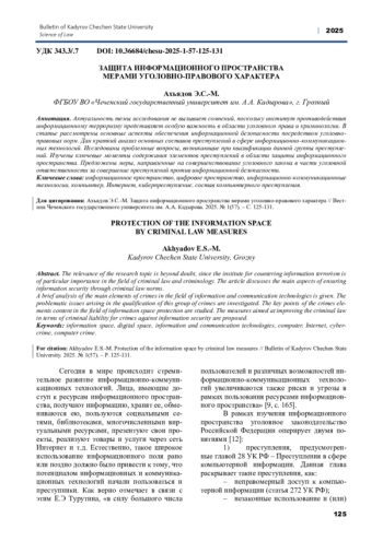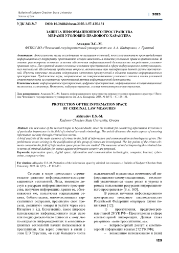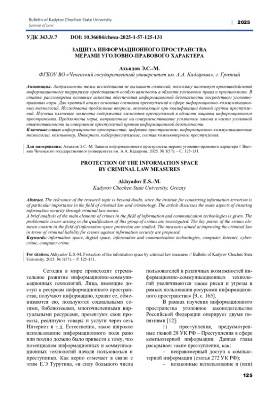 АХЪЯДОВ Э. С. ЗАЩИТА ИНФОРМАЦИОННОГО ПРОСТРАНСТВА МЕРАМИ УГОЛОВНО-ПРАВОВОГО ХАРАКТЕРА // ВЕСТНИК ЧЕЧЕНСКОГО ГОСУДАРСТВЕННОГО УНИВЕРСИТЕТА ИМ. А. А. КАДЫРОВА. 2025. № 1 (57)