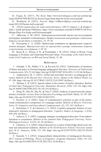 1. Глушак, В. М., Мюллер, Ю. Э., & Ковач, М. (2021). Вербализация интенций порицания и похвалы в немецкоязычном педагогическом дискурсе. Дискурс профессиональной коммуникации, 3(3), 52-64. DOI: 10.24833/2687-0126-2021-3-3-52-64 EDN: EEIMZQ