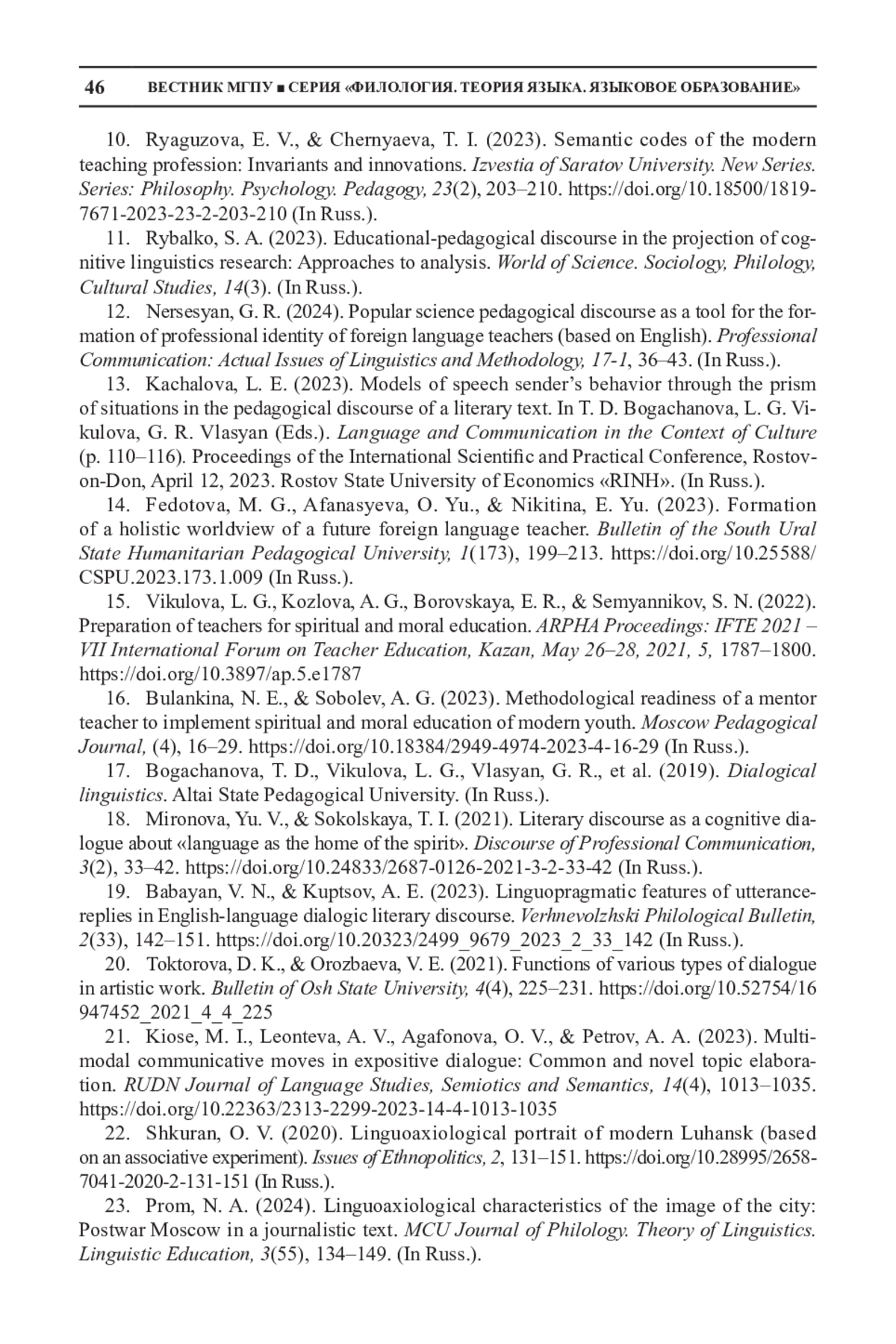 9. Карасик, В. И. (2023). Лингвокультурные характеристики педагогического дискурса. Вестник МГПУ. Серия “Филология. Теория языка. Языковое образование”, 2(50), 118-129. DOI: 10.25688/2076-913X.2023.50.2.10 EDN: CZJENK