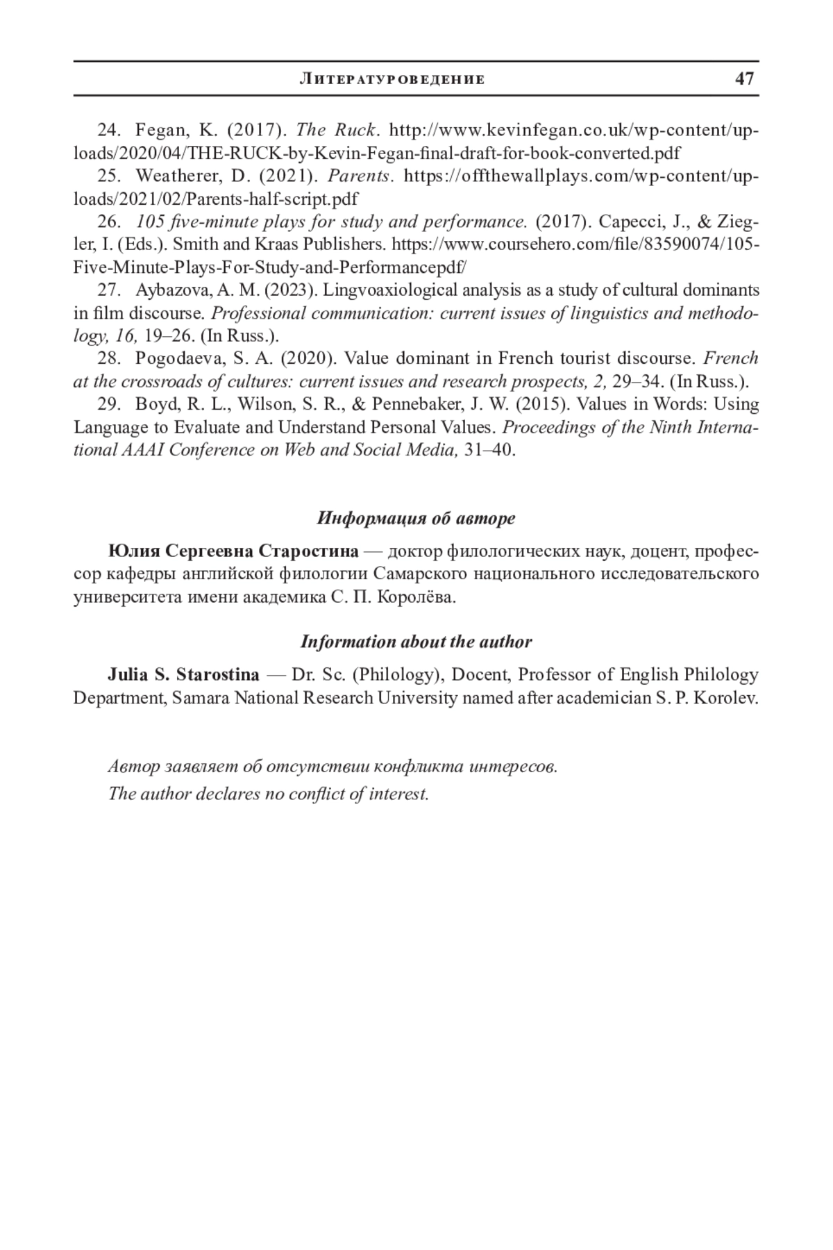 27. Айбазова, А. М. (2023). Лингвоаксиологический анализ как исследование культурных доминант в кинодискурсе. Профессиональная коммуникация: актуальные вопросы лингвистики и методики, 16, 19-26. EDN: SHGEDY