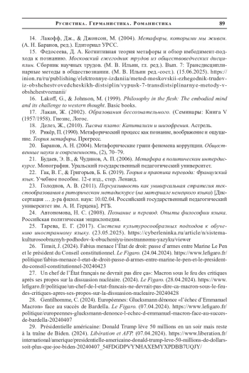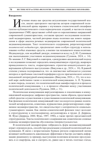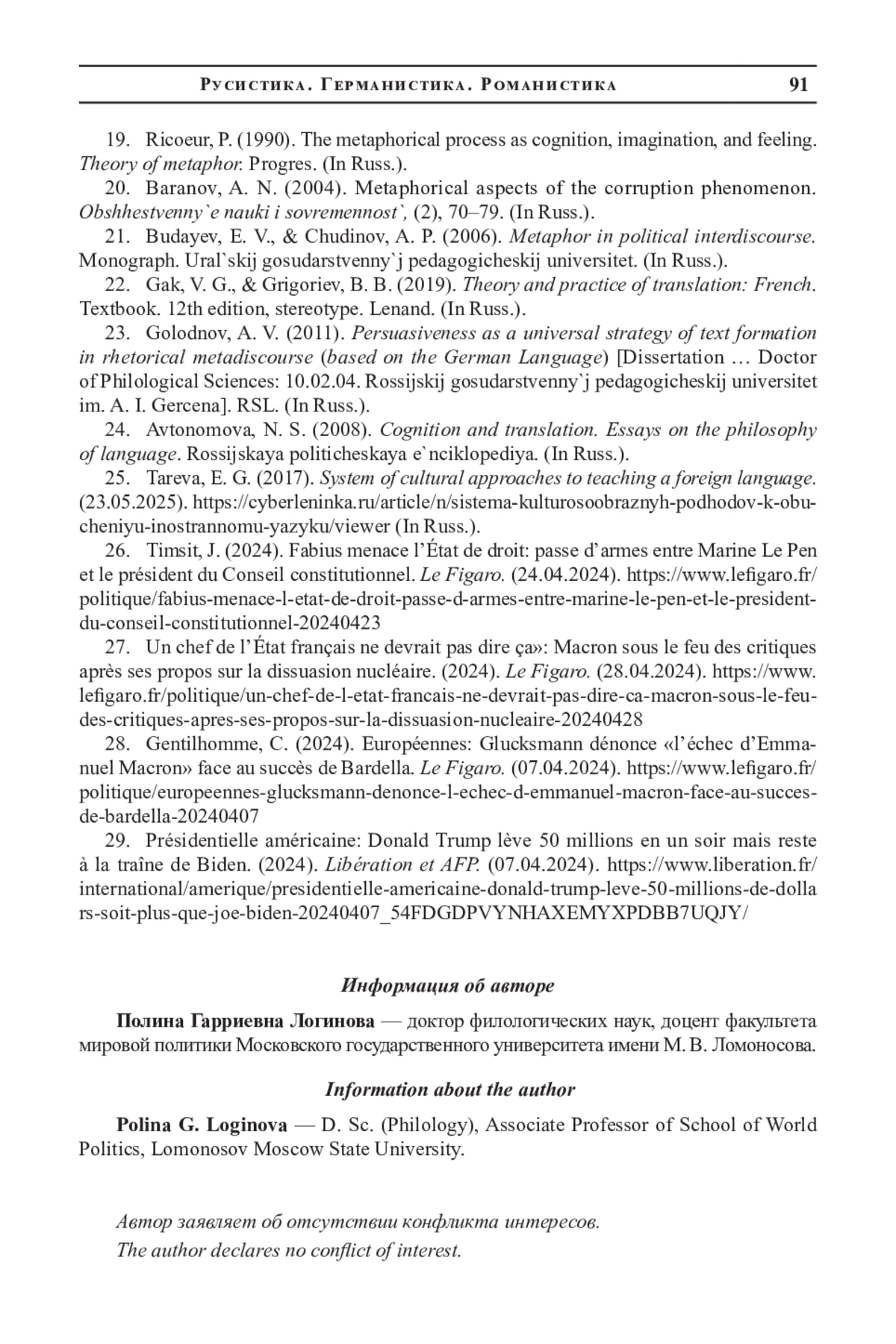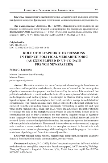 Статья: МЕТАФОРИЧЕСКИЙ КОМПОНЕНТ КАК ПРЕДМЕТ ИССЛЕДОВАНИЯ ПОЛИТИЧЕСКОЙ МЕДИАРИТОРИКИ (НА МАТЕРИАЛЕ ТРАДИЦИОННЫХ ФРАНЦУЗСКИХ СМИ) (2025)