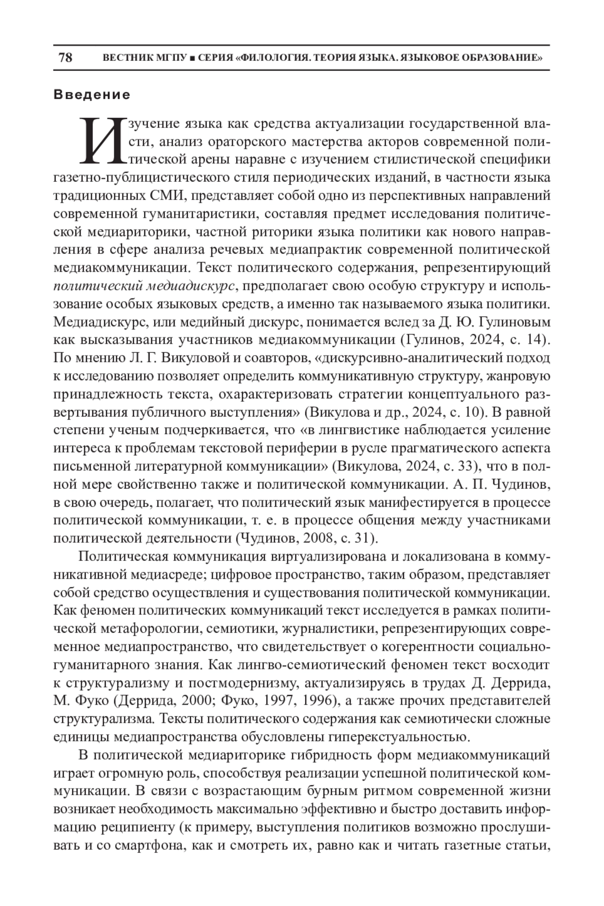 ЛОГИНОВА П. Г. МЕТАФОРИЧЕСКИЙ КОМПОНЕНТ КАК ПРЕДМЕТ ИССЛЕДОВАНИЯ ПОЛИТИЧЕСКОЙ МЕДИАРИТОРИКИ (НА МАТЕРИАЛЕ ТРАДИЦИОННЫХ ФРАНЦУЗСКИХ СМИ) // ВЕСТНИК МГПУ. СЕРИЯ: ФИЛОЛОГИЯ. ТЕОРИЯ ЯЗЫКА. ЯЗЫКОВОЕ ОБРАЗОВАНИЕ. 2025. № 3 (59)