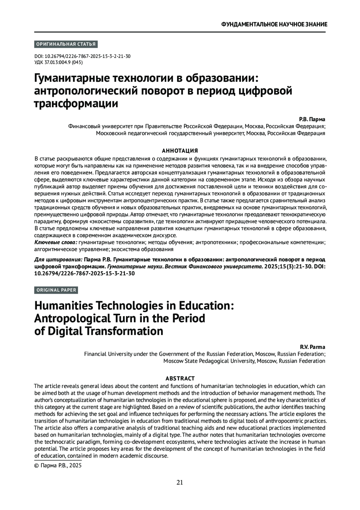 В статье раскрываются общие представления о содержании и функциях гуманитарных технологий в образовании, которые могут быть направлены как на применение методов развития человека, так и на внедрение способов управления его поведением. Предлагается авторская концептуализация гуманитарных технологий в образовательной сфере, выделяются ключевые характеристики данной категории на современном этапе. Исходя из обзора научных публикаций автор выделяет приемы обучения для достижения поставленной цели и техники воздействия для совершения нужных действий. Статья исследует переход гуманитарных технологий в образовании от традиционных методов к цифровым инструментам антропоцентрических практик. В статье также предлагается сравнительный анализ традиционных средств обучения и новых образовательных практик, внедряемых на основе гуманитарных технологий, преимущественно цифровой природы. Автор отмечает, что гуманитарные технологии преодолевают технократическую парадигму, формируя «экосистемы соразвития», где технологии активируют приращение человеческого потенциала. В статье предложены ключевые направления развития концепции гуманитарных технологий в сфере образования, содержащиеся в современном академическом дискурсе.