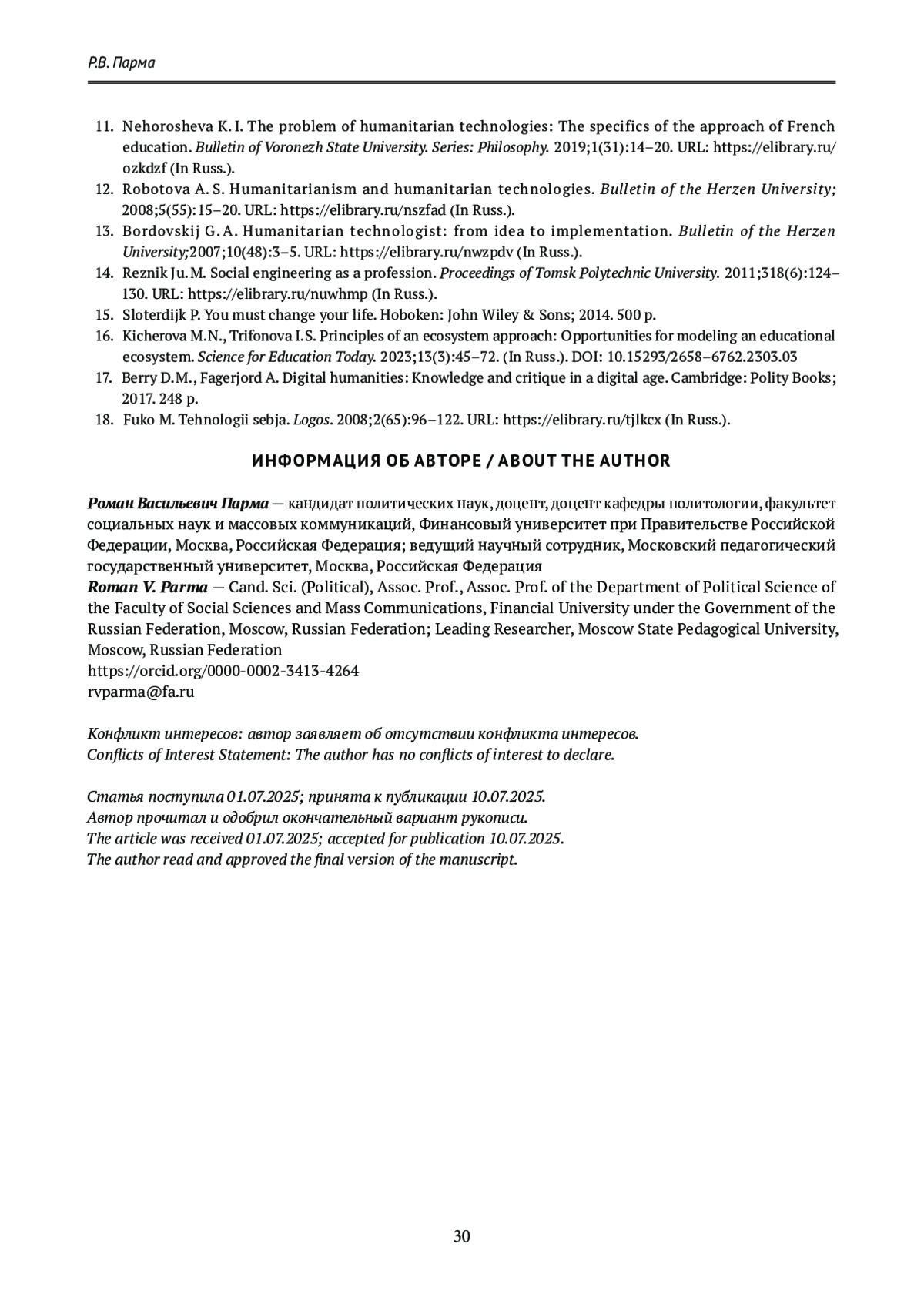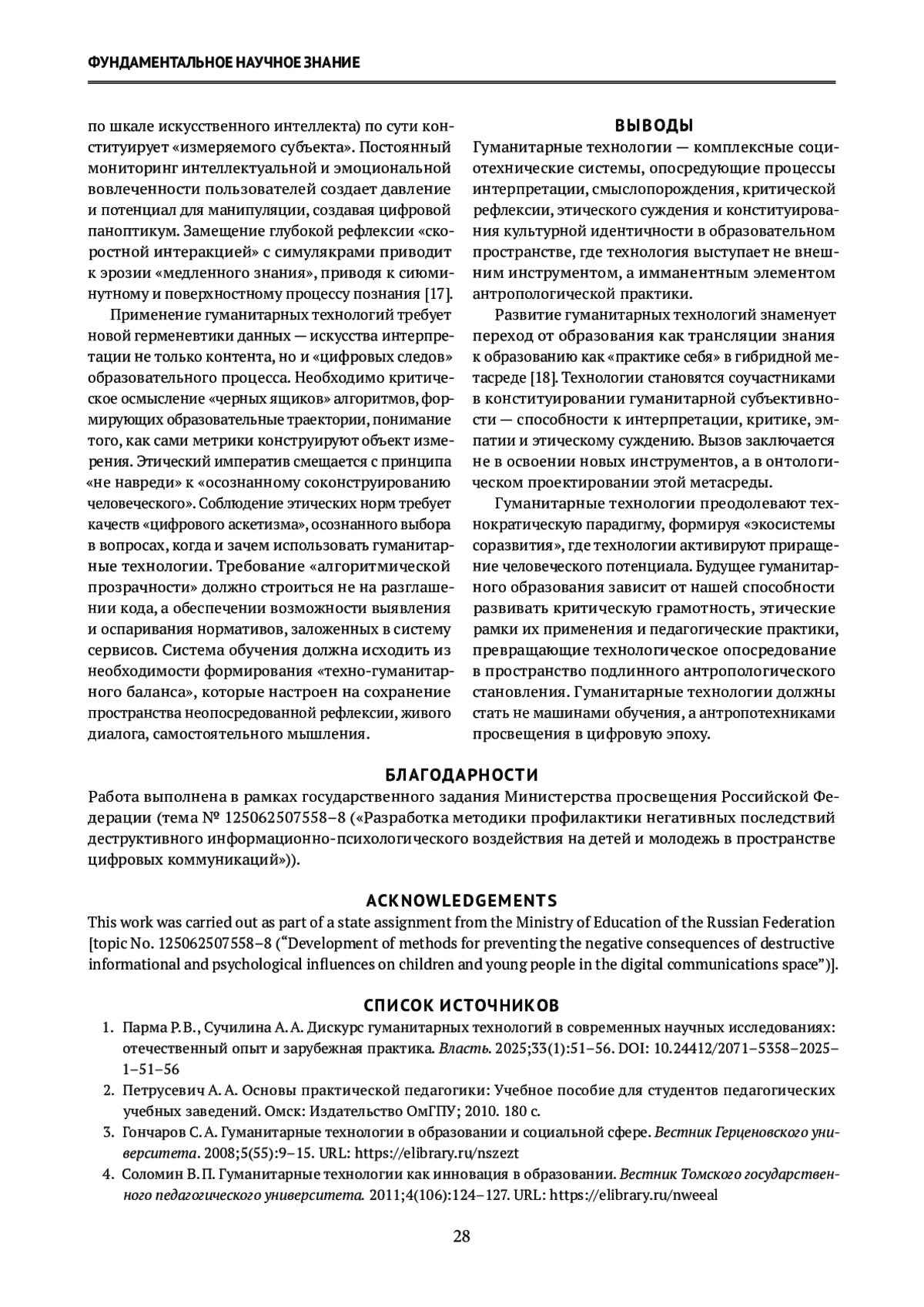 1. Парма Р. В., Сучилина А. А. Дискурс гуманитарных технологий в современных научных исследованиях: отечественный опыт и зарубежная практика. Власть. 2025;33(1):51-56. https://doi.org/10.24412/2071-5358-2025-1-51-56