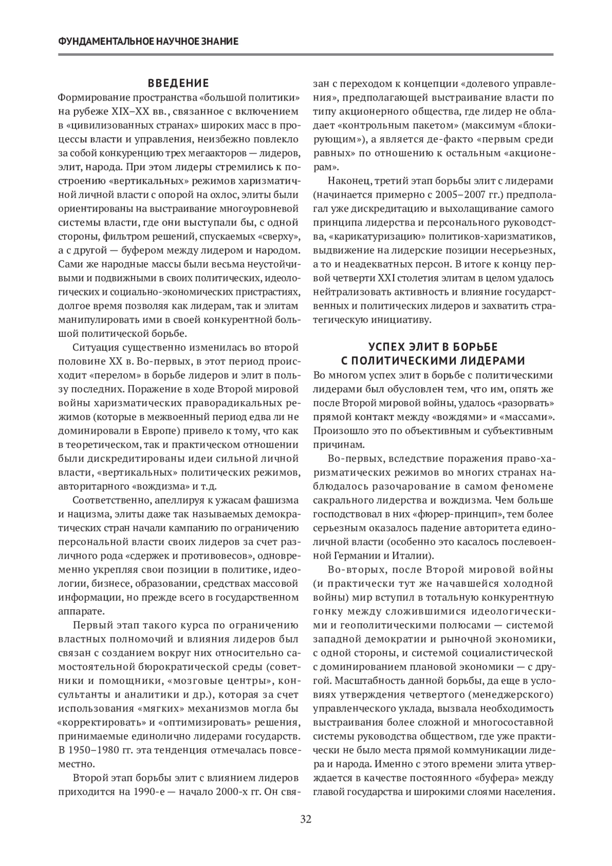 В статье рассматривается проблема борьбы за влияние между элитой и средним классом в современных государствах. Исследование охватывает период со второй половины XX в. до настоящего времени, выделяя два ключевых этапа противостояния. В первой половине анализируемого периода элита и средний класс выступали союзниками в борьбе против персонального доминирования политических лидеров. Однако после нейтрализации «диктаторского» потенциала института лидерства в 2000-е гг. элита развернула активную кампанию против среднего класса, который к тому времени накопил значительный социальный, материальный и интеллектуальный капитал и стал представлять угрозу для властных позиций истеблишмента. Автор анализирует меры, предпринятые элитой для снижения авторитета среднего класса в обществах «цивилизованных» стран и установления полного контроля над формированием повестки развития человечества. В заключении отмечается, что, несмотря на продолжающееся противостояние, элита сохраняет существенное преимущество как над политическими лидерами, так и над народным большинством, ядро которого составляет средний класс.