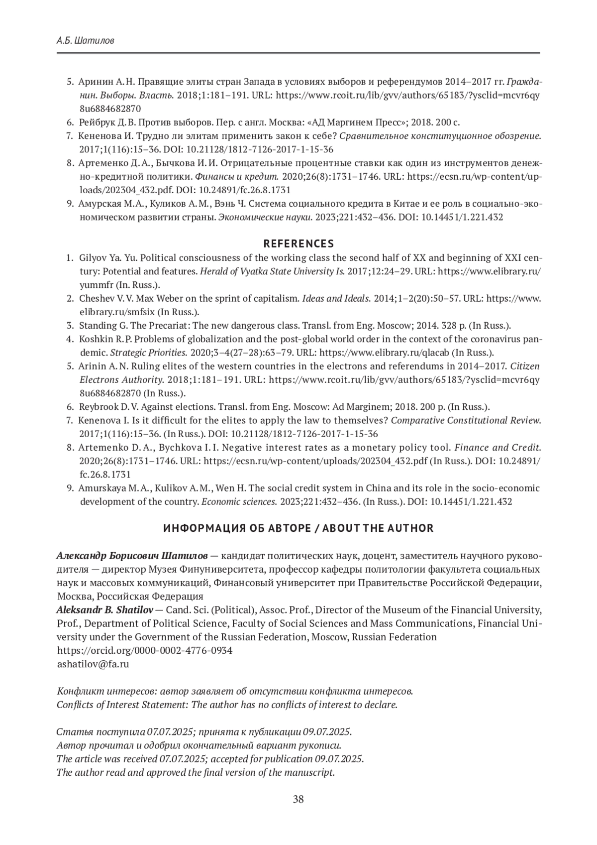 5. Аринин А. Н. Правящие элиты стран Запада в условиях выборов и референдумов 2014-2017 гг. Гражданин. Выборы. Власть. 2018;1:181-191. URL: https://www.rcoit.ru/lib/gvv/authors/65183/?ysclid=mcvr6qy8u6884682870