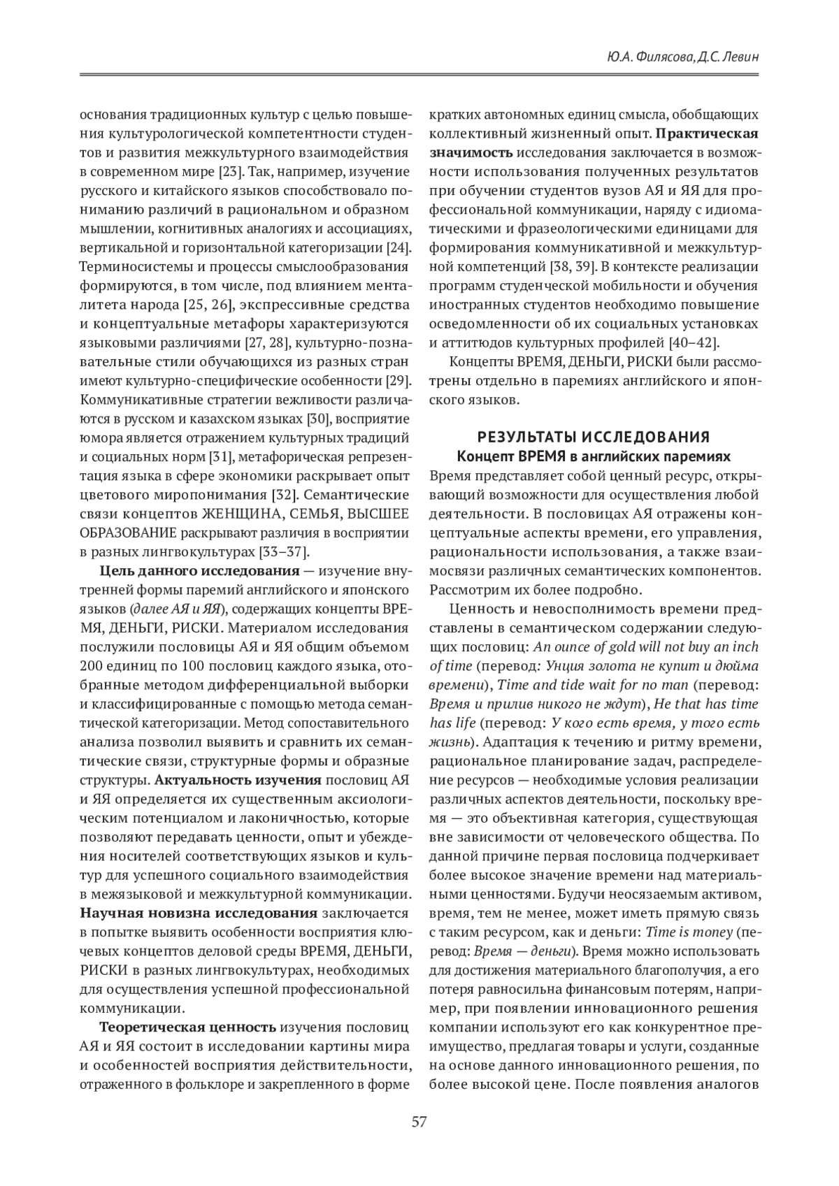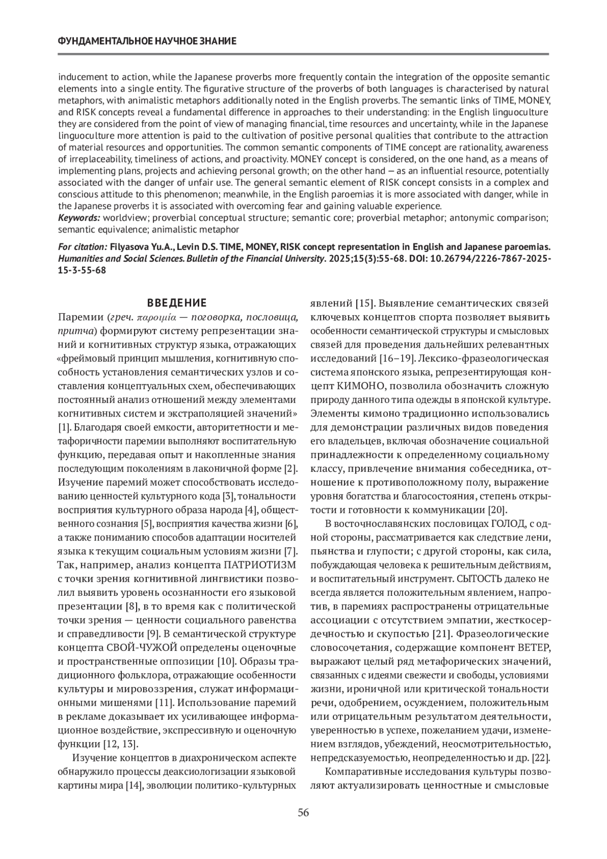 В статье представлены результаты сопоставительного анализа внутренней формы паремий английского и японского языков, содержащих концепты ВРЕМЯ, ДЕНЬГИ, РИСКИ. Объектом исследования стали семантические связи, структурные формы и образные структуры паремий, отобранные методом дифференциальной выборки. Актуальность проблематики обусловлена необходимостью изучения аксиологического потенциала паремий в английской и японской лингвокультурах для понимания межкультурных различий в мировосприятии и аттитюдов культурных кодов. В соответствии с полученными данными, концептуальная структура паремий представляет собой, главным образом, контраст и отождествление, реже исключение, инкорпорирование и параллелизм. Дифференциальным признаком английских пословиц является повторение структур в повелительном наклонении с явно выраженным побуждением к действию, в то время как японские пословицы чаще интегрируют противоположные смысловые элементы в единое целое. Образная структура пословиц характеризуется природными метафорами, при этом в английских паремиях дополнительно были отмечены анималистические метафоры. Семантические связи концептов ВРЕМЯ, ДЕНЬГИ, РИСКИ раскрывают принципиальную разницу в подходах к пониманию концептов: в английской лингвокультуре они рассматриваются с точки зрения управления человеком финансовыми, временными ресурсами и неопределенностью, в то время как в японской лингвокультуре больше внимания уделяется воспитанию положительных качеств личности, способствующих притяжению материальных ресурсов и возможностей. Общими семантическими компонентами концепта ВРЕМЯ являются рациональность, осознание невосполнимости, своевременности действий, проактивность. Концепт ДЕНЬГИ рассматривается, с одной стороны, как средство реализации планов, проектов и личностного роста, с другой стороны — как влиятельный ресурс, потенциально связанный с опасностью злоупотребления и неправомерного использования. Интегральный смысловой компонент концепта РИСКИ заключается в комплексном и сознательном отношении к данному явлению, при этом в паремиях английского языка он в большей степени ассоциируется с опасностью, в то время как в японском языке — с преодолением страха и получением ценного опыта.