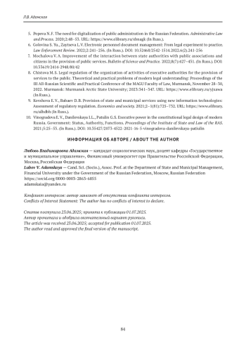 7. Мочалова В. А. Совершенствование взаимодействия органов государственной власти с общественными объединениями и гражданами при предоставлении государственных услуг. Бюллетень науки и практики. 2022;8(7):427-431. https://doi.org/10.33619/2414-2948/80/42