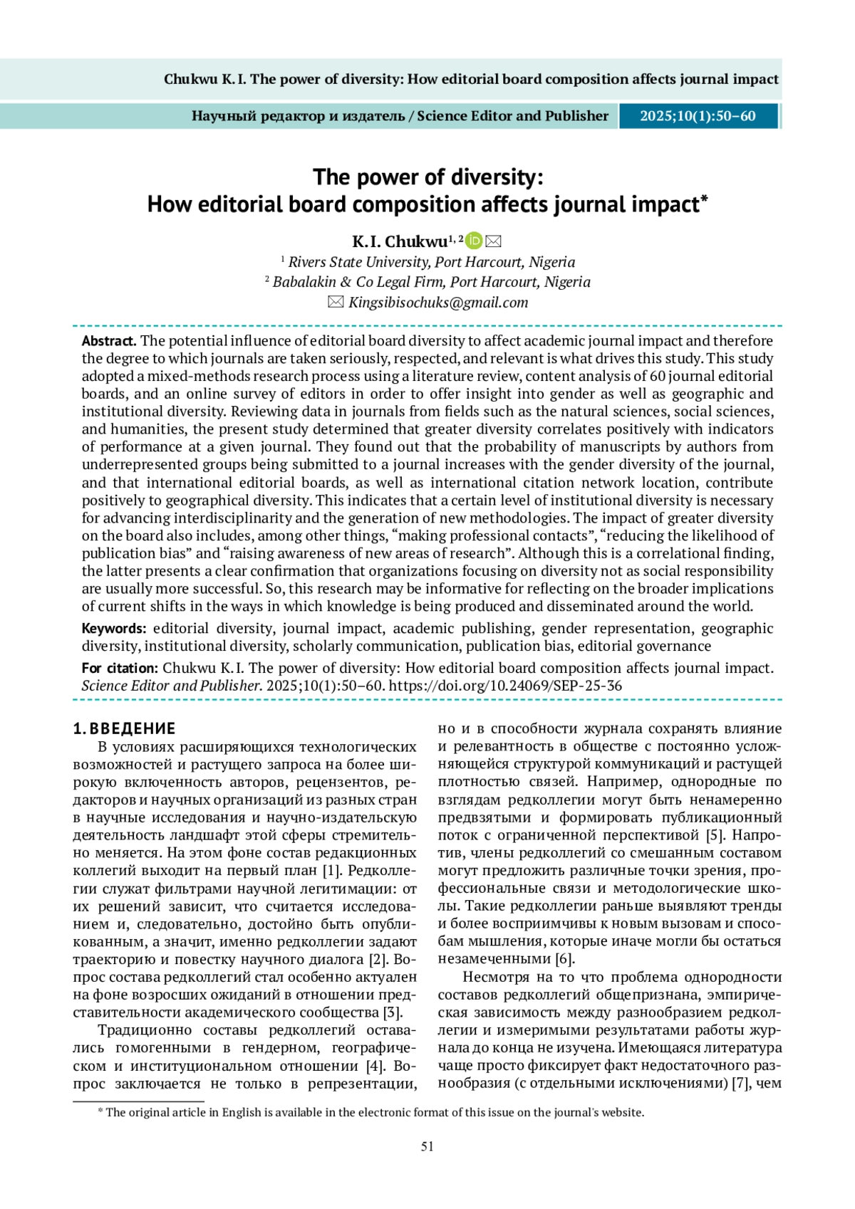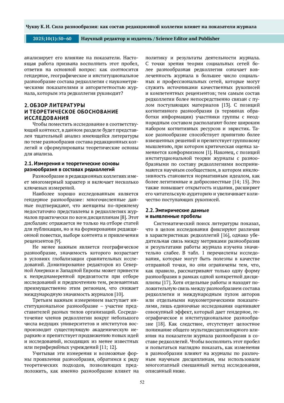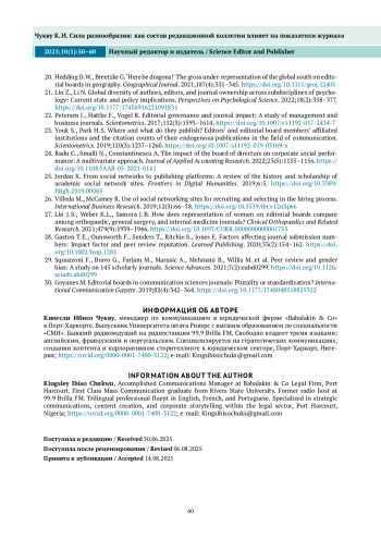 Настоящее исследование исходит из предположения, что разнообразие состава редакционной коллегии сказывается на наукометрических показателях журнала и, как следствие, на уровне его признания, авторитетности и актуальности. В исследовании применен смешанный дизайн для оценки гендерного, географического и институционального разнообразия, включающий в себя обзор литературы, контент-анализ составов редколлегий 60 журналов и онлайн-опрос редакторов. На основе данных, полученных из журналов по естественным, социальным и гуманитарным наукам, показано, что большее разнообразие состава редколлегии положительно коррелирует с наукометрическими показателями журнала. Показано, что с ростом гендерного разнообразия редколлегии повышается вероятность подачи рукописей авторами из недостаточно представленных групп. Кроме того, международный состав редколлегии и место журнала в глобальной сети цитирования положительно коррелируют с географическим разнообразием авторов. Это свидетельствует о том, что определенный уровень институционального разнообразия необходим для развития междисциплинарности и появления новых методологических подходов. Более разнообразная по составу редколлегия приводит к «формированию профессиональных контактов», «уменьшению вероятности проявления публикационной предвзятости» и «повышению осведомленности о новых направлениях исследований». Несмотря на корреляционный характер результатов исследования, они подтверждают вывод о том, что организации, рассматривающие разнообразие не как элемент социальной ответственности, обычно добиваются бо́льших успехов. Таким образом, полученные результаты полезны для осмысления более широких последствий текущих изменений в способах производства и распространения знаний во всем мире.