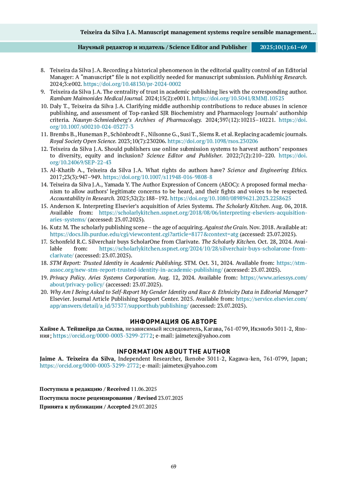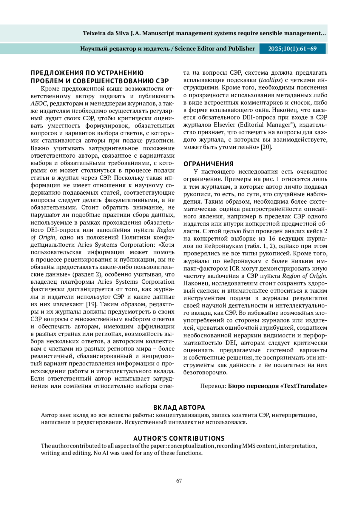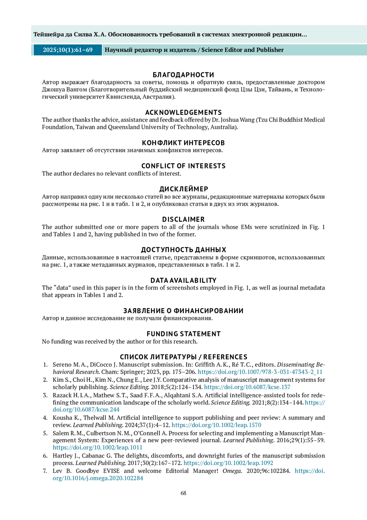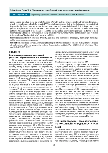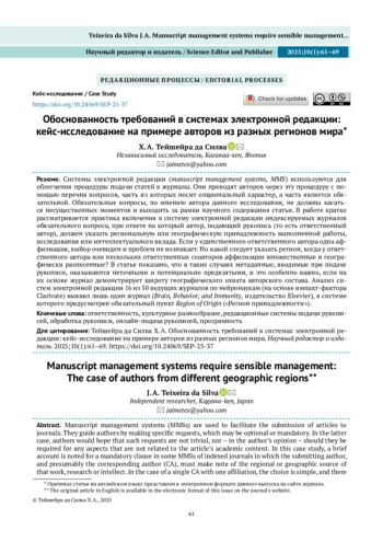 ХАЙМЕ А. Т. ОБОСНОВАННОСТЬ ТРЕБОВАНИЙ В СИСТЕМАХ ЭЛЕКТРОННОЙ РЕДАКЦИИ: КЕЙС-ИССЛЕДОВАНИЕ НА ПРИМЕРЕ АВТОРОВ ИЗ РАЗНЫХ РЕГИОНОВ МИРА* // НАУЧНЫЙ РЕДАКТОР И ИЗДАТЕЛЬ. 2025. № 1, ТОМ 10