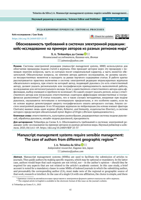 Системы электронной редакции (manuscript management systems, MMS) используются для облегчения процедуры подачи статей в журналы. Они проводят авторов через эту процедуру с помощью перечня вопросов, часть из которых носит опциональный характер, а часть является обязательной. Обязательные вопросы, по мнению автора данного исследования, не должны касаться несущественных моментов и выходить за рамки научного содержания статьи. В работе кратко рассматривается практика включения в систему электронной редакции индексируемых журналов обязательного вопроса, при ответе на который автор, подающий рукопись (то есть ответственный автор), должен указать региональную или географическую принадлежность выполненной работы, исследования или интеллектуального вклада. Если у единственного ответственного автора одна аффилиация, выбор очевиден и проблем не возникает. Но какой следует указать регион, когда у ответственного автора или нескольких ответственных соавторов аффилиации множественные и географически разнесенные? В статье показано, что в таких случаях метаданные, вводимые при подаче рукописи, оказываются неточными и потенциально предвзятыми, и это особенно важно, если на их основе журнал демонстрирует широту географического охвата авторского состава. Анализ систем электронной редакции 16 из 50 ведущих журналов по нейронаукам (на основе импакт-фактора Clarivate) выявил лишь один журнал (Brain, Behavior, and Immunity, издательство Elsevier), в системе которого предусмотрен обязательный пункт Region of Origin («Регион принадлежности»).