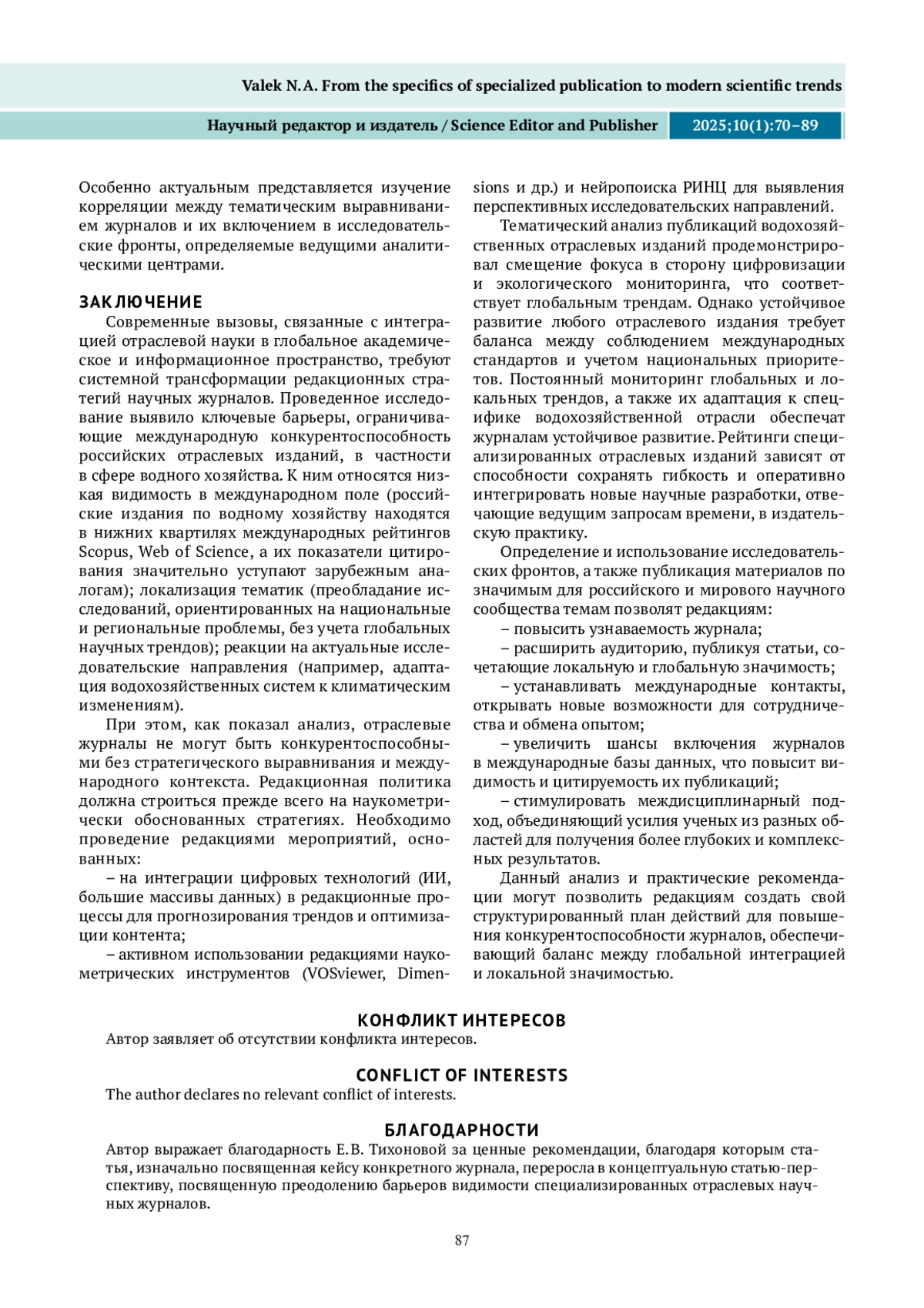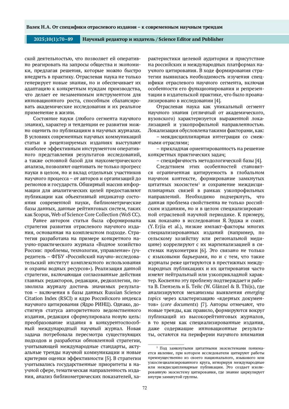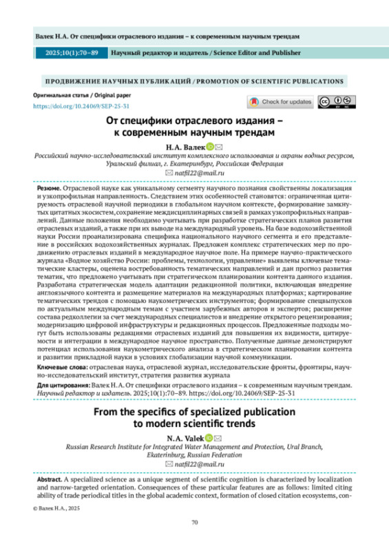 ВАЛЕК Н. А. ОТ СПЕЦИФИКИ ОТРАСЛЕВОГО ИЗДАНИЯ – К СОВРЕМЕННЫМ НАУЧНЫМ ТРЕНДАМ // НАУЧНЫЙ РЕДАКТОР И ИЗДАТЕЛЬ. 2025. № 1, ТОМ 10