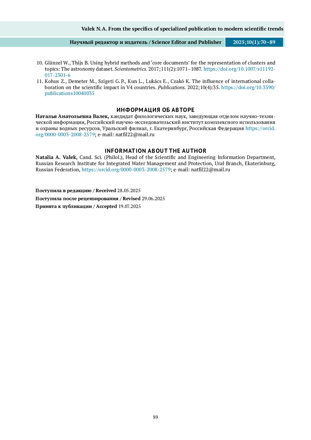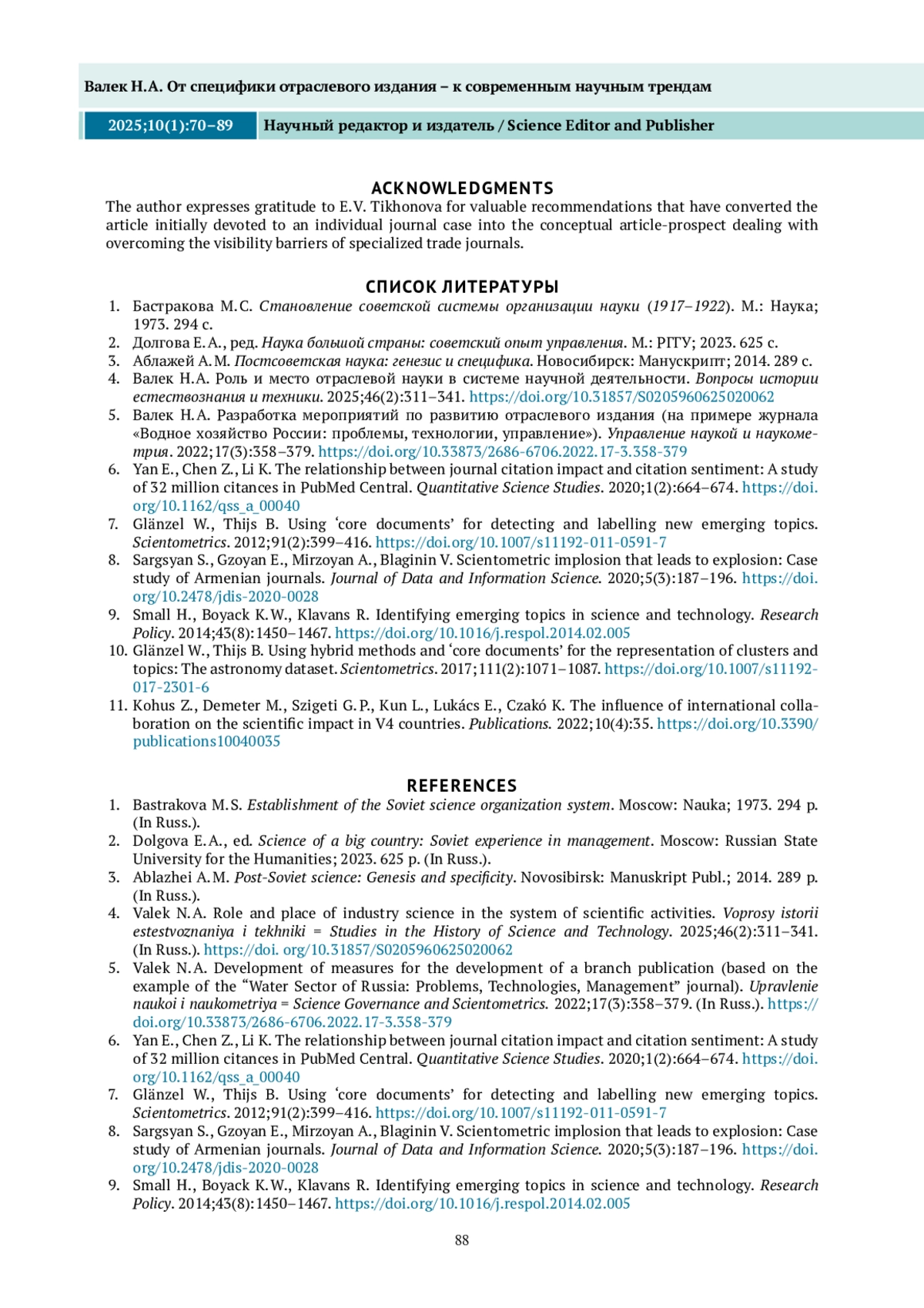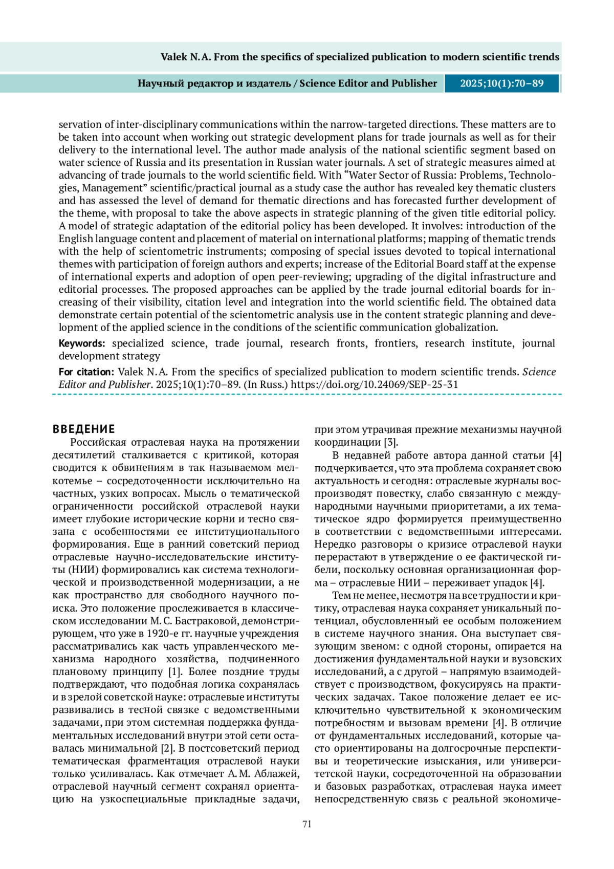 ВАЛЕК Н. А. ОТ СПЕЦИФИКИ ОТРАСЛЕВОГО ИЗДАНИЯ – К СОВРЕМЕННЫМ НАУЧНЫМ ТРЕНДАМ // НАУЧНЫЙ РЕДАКТОР И ИЗДАТЕЛЬ. 2025. № 1, ТОМ 10