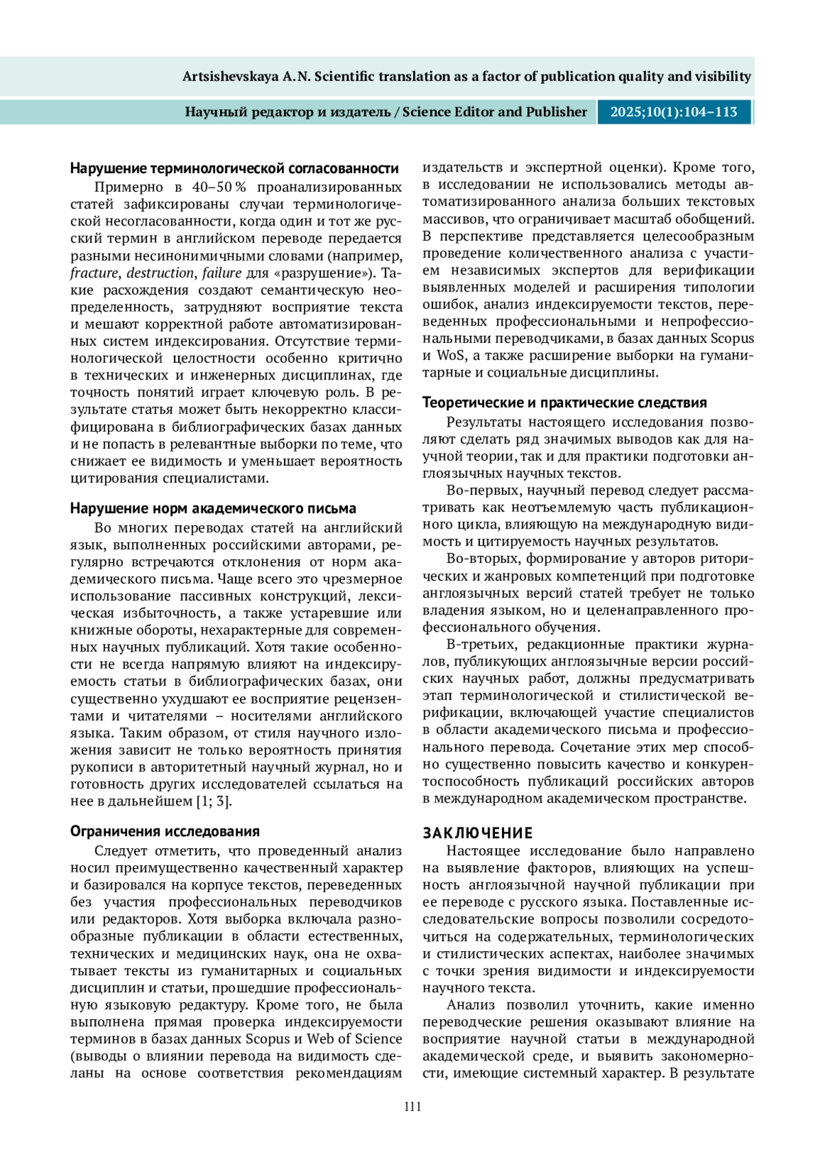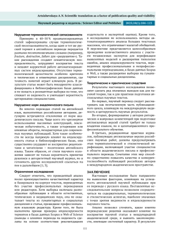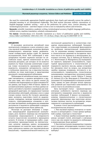 В условиях глобализации науки и растущей конкуренции за внимание международной аудитории качественный научный перевод становится неотъемлемой частью эффективной академической коммуникации. В статье подчеркивается роль английского языка как основного средства международного научного общения и анализируется влияние точного и стилистически выверенного перевода на восприятие статьи, ее видимость в научных базах данных и цитируемость. Особое внимание уделяется отличию научного перевода от литературного и технического, а также типичным ошибкам, возникающим при использовании автоматизированных систем перевода. На основе реальных примеров показано, как неточности в переводе заглавий, аннотаций, ключевых слов и подписей к графическим элементам статей могут снижать научную значимость публикации и затруднять ее индексирование. Отдельная часть посвящена работе с научной терминологией в различных областях знания. Подчеркивается важность не буквального, а контекстуально точного перевода с подбором адекватных английских эквивалентов, понятных международному академическому сообществу. В заключительной части рассматриваются стилистические особенности англоязычного научного дискурса, такие как предпочтение активного залога, компактной структуры и смысловой точности формулировок, и их влияние на восприятие текста редакторами и рецензентами.