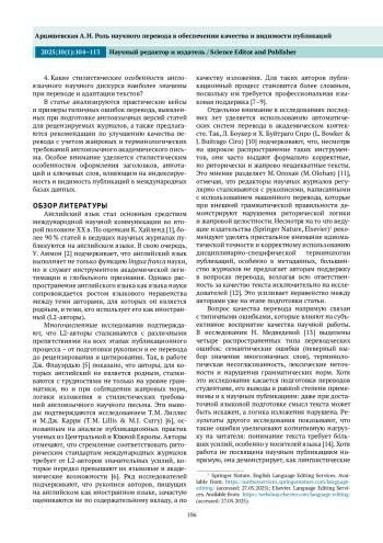 В последние десятилетия английский язык окончательно утвердился в роли основного средства научной коммуникации, выполняя функции универсального медиатора между академическими сообществами разных стран. По оценкам исследователей, более 90 % публикаций в международных научных журналах выходят на английском языке, причем значительная их часть написана авторами, для которых он не является родным [1]. Такая языковая асимметрия создает как новые возможности (расширение научной видимости, повышение цитируемости, участие в глобальных проектах), так и серьезные вызовы, особенно на этапе подготовки и представления рукописей к международной публикации.