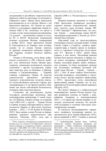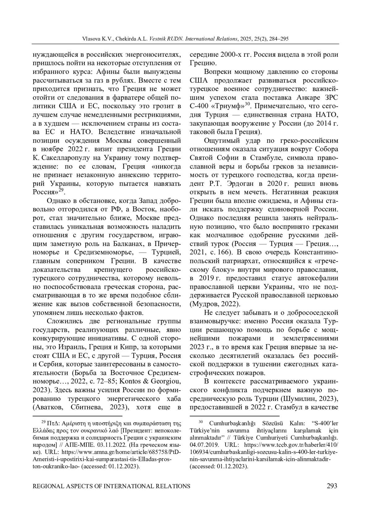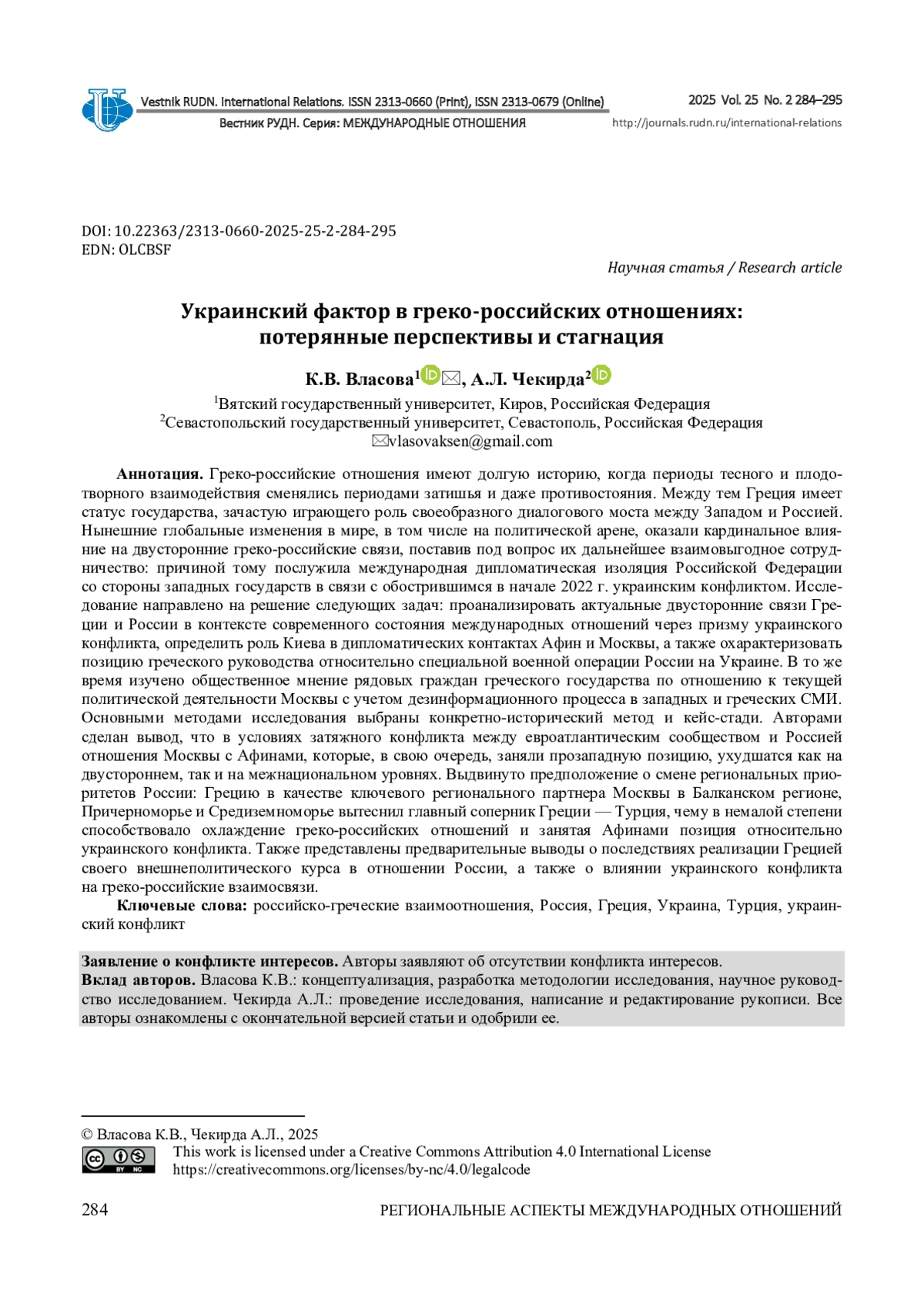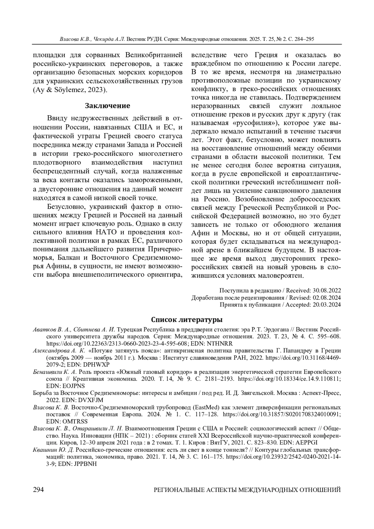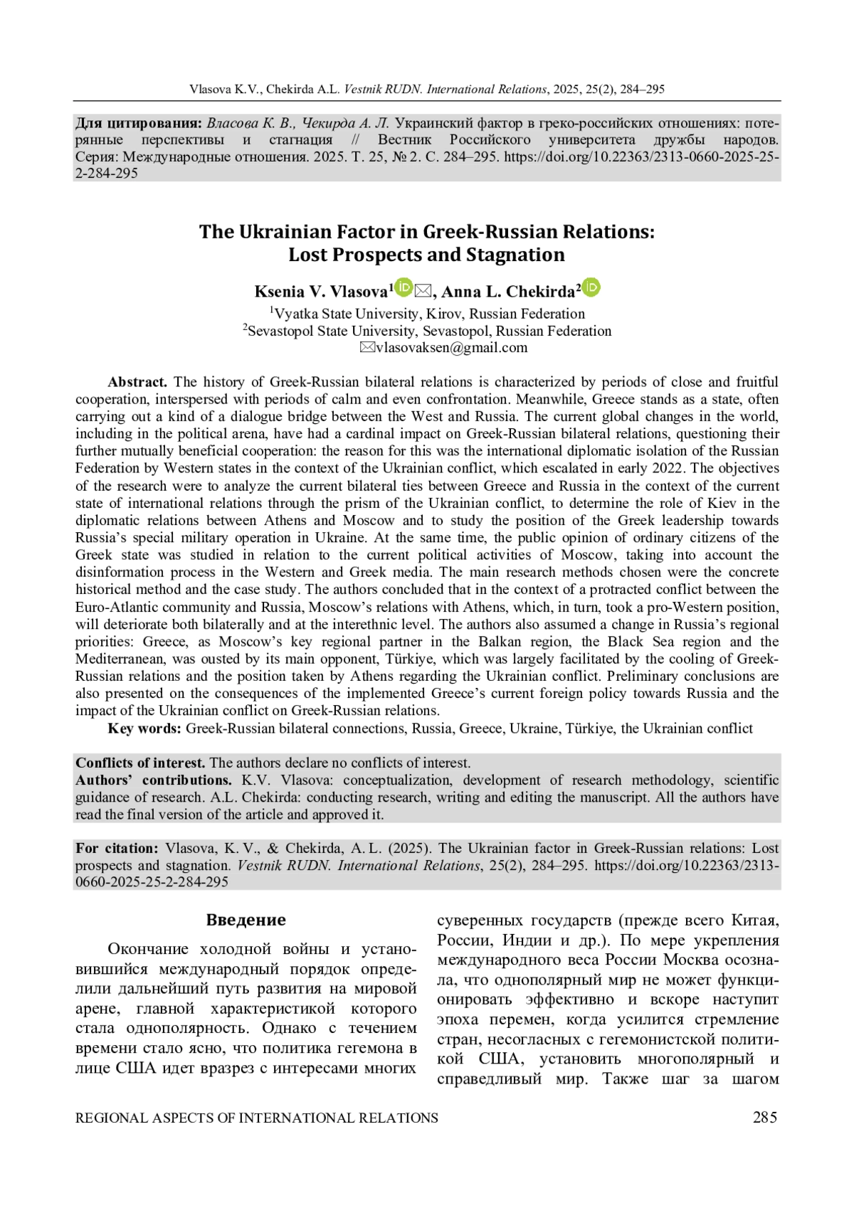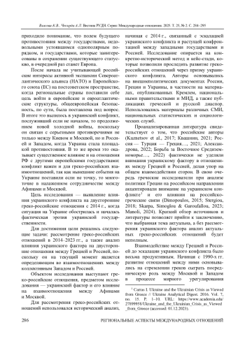 ВЛАСОВА К. В., ЧЕКИРДА А. Л. УКРАИНСКИЙ ФАКТОР В ГРЕКО-РОССИЙСКИХ ОТНОШЕНИЯХ: ПОТЕРЯННЫЕ ПЕРСПЕКТИВЫ И СТАГНАЦИЯ // ВЕСТНИК РОССИЙСКОГО УНИВЕРСИТЕТА ДРУЖБЫ НАРОДОВ. СЕРИЯ: МЕЖДУНАРОДНЫЕ ОТНОШЕНИЯ. 2025. ТОМ 25 № 2