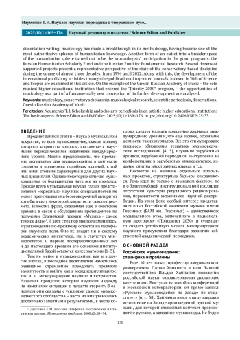 В статье представлен анализ научной деятельности в музыкальных вузах России, охватывающий различные этапы развития музыковедческой науки. Исследование фокусируется как на положении музыковедения в структуре творческого вуза, так и на особенностях его постепенного вхождения в общенаучное пространство, что в разные десятилетия XX в. происходило через различные формы интеграции. Одна из таких форм – диссертационная деятельность музыковедов, берущая начало в 1930-е гг. Именно благодаря диссертационной практике музыковедение совершило методологический прорыв, став одной из самых авторитетных областей гуманитарного знания. Еще одной формой выхода в более широкое пространство гуманитаристики стало участие музыковедов в грантовых программах Российского гуманитарного научного фонда и Российского фонда фундаментальных исследований. Несколько десятков поддержанных проектов отражают состояние консерваторской науки на протяжении почти трех десятилетий: с 1994 до 2022 г. Международная публикационная активность музыковедов рассматривается через призму издания и развития высокорейтинговых журналов, индексируемых в Web of Science и Scopus. На примере Российской академии музыки имени Гнесиных анализируется потенциал музыковедения в рамках принципиально новой концепции его дальнейшего развития.