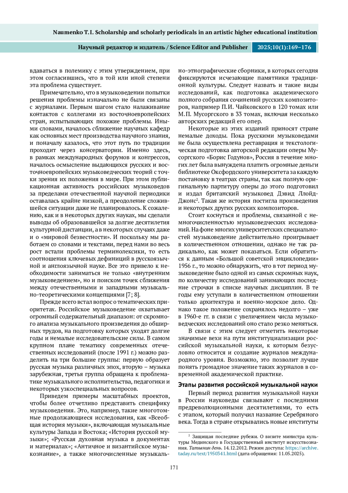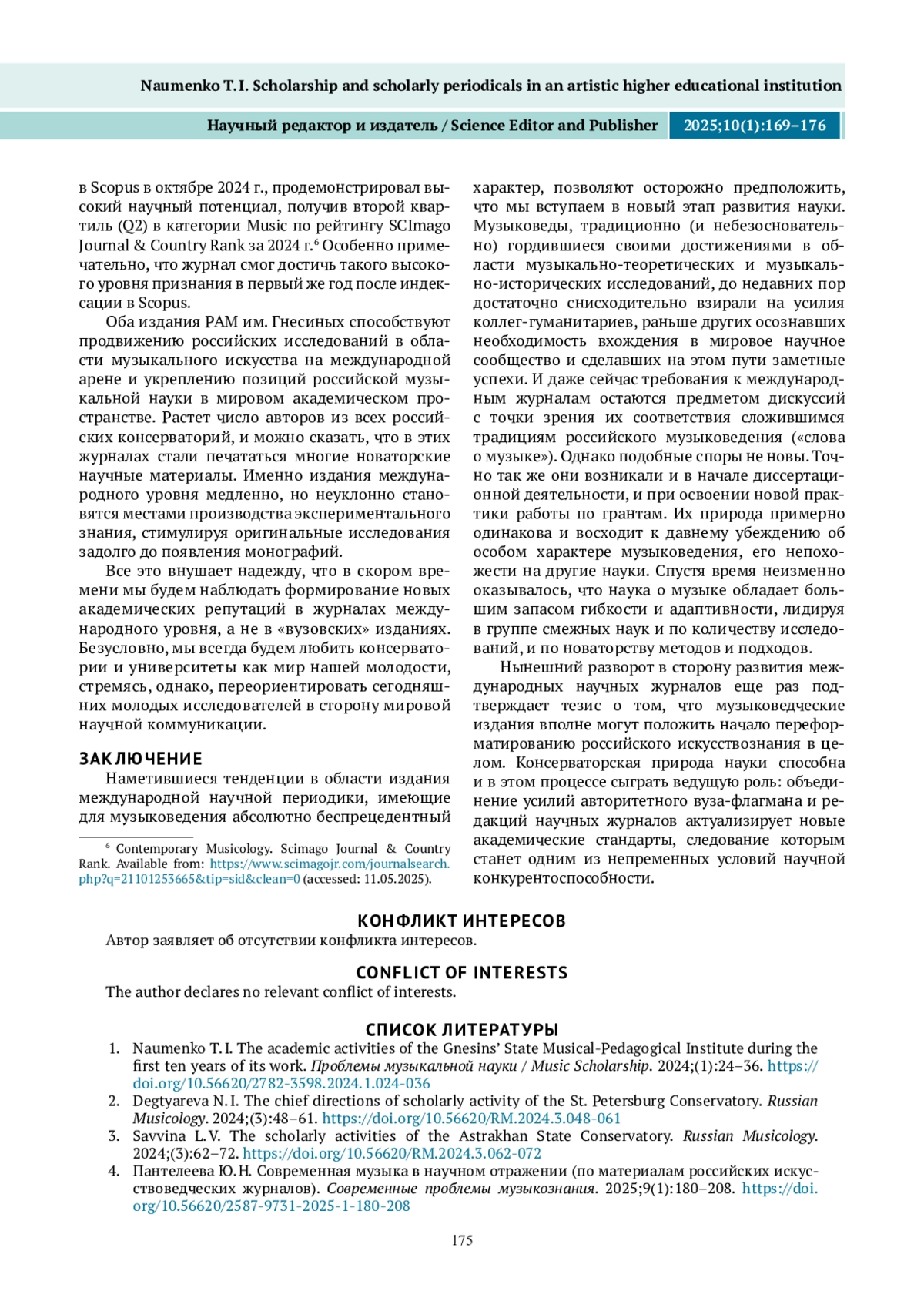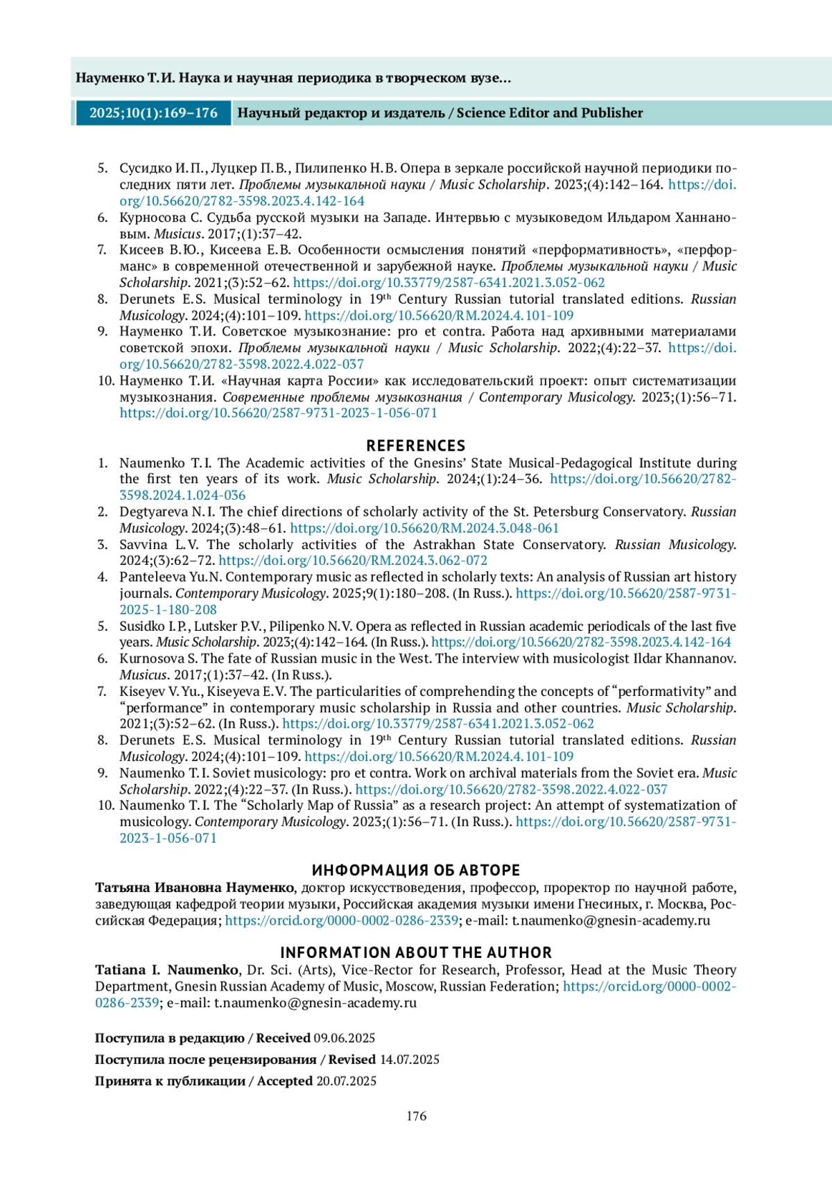 10. Науменко Т. И. “Научная карта России” как исследовательский проект: опыт систематизации музыкознания. Современные проблемы музыкознания / Contemporary Musicology. 2023;(1):56-71.