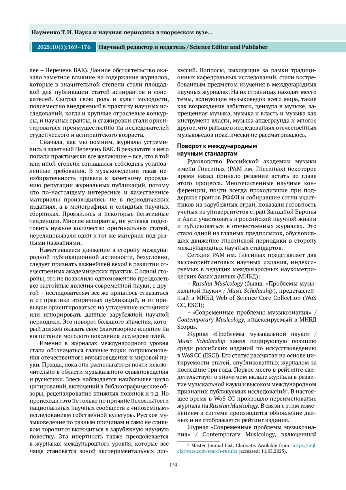 Предмет данной статьи – наука о музыкальном искусстве, то есть музыковедение, сквозь призму которого затронуты вопросы, связанные с научными периодическими изданиями международного уровня. Можно предположить, что проблемы, актуальные для музыковедения в контексте создания и поддержки подобных изданий, в той или иной степени характерны и для других научных дисциплин. Однако некоторые отличия музыковедения от большинства наук все же имеются. Прежде всего музыкальная наука в глазах представителей «серьезных» научных специальностей не может претендовать на безоговорочный авторитет хотя бы в силу некоторой закрытости самого предмета. Известна фраза, сказанная еще в советские времена в связи с обсуждением претендентов на получение Сталинской премии: «Музыка – самое темное дело»1. И хотя с тех пор многое изменилось, музыковедение по-прежнему остается на периферии научного поля. Оно не входит ни в систему академических институтов, ни в структуру университетов. С первых послереволюционных лет и до настоящего времени его основной институциональной базой остаются консерватории [1–3].