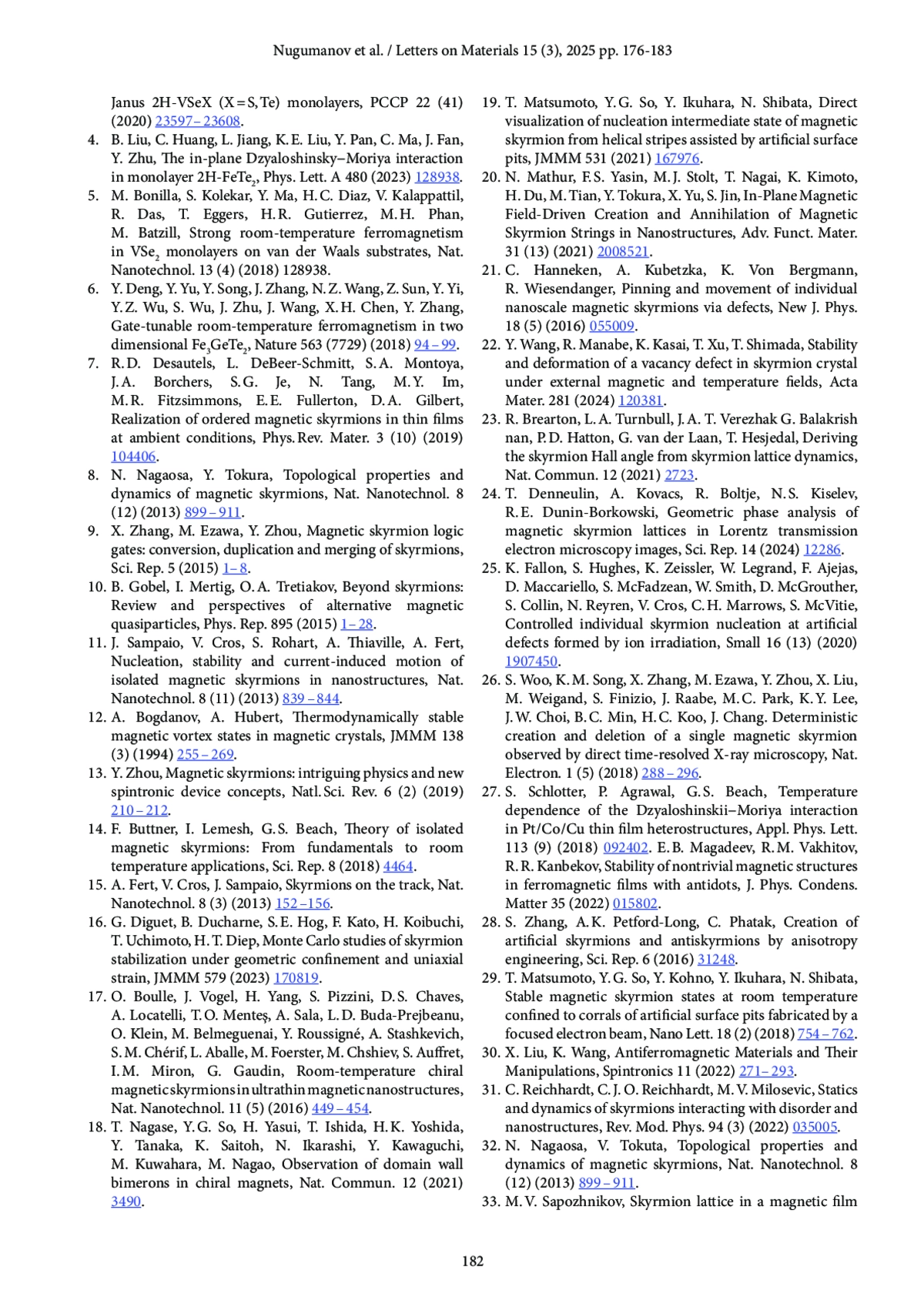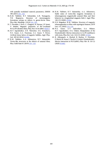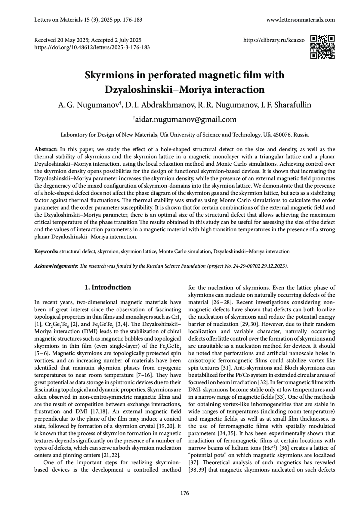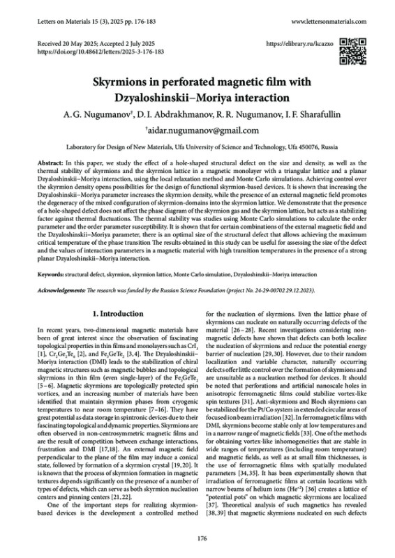НУГУМАНОВ А. Г., АБДРАХМАНОВ Д. И., НУГУМАНОВ Р. Р., ШАРАФУЛЛИН И. Ф. SKYRMIONS IN PERFORATED MAGNETIC FILM WITH DZYALOSHINSKII−MORIYA INTERACTION // ПИСЬМА О МАТЕРИАЛАХ. 2025. № 3 (59), ТОМ 15