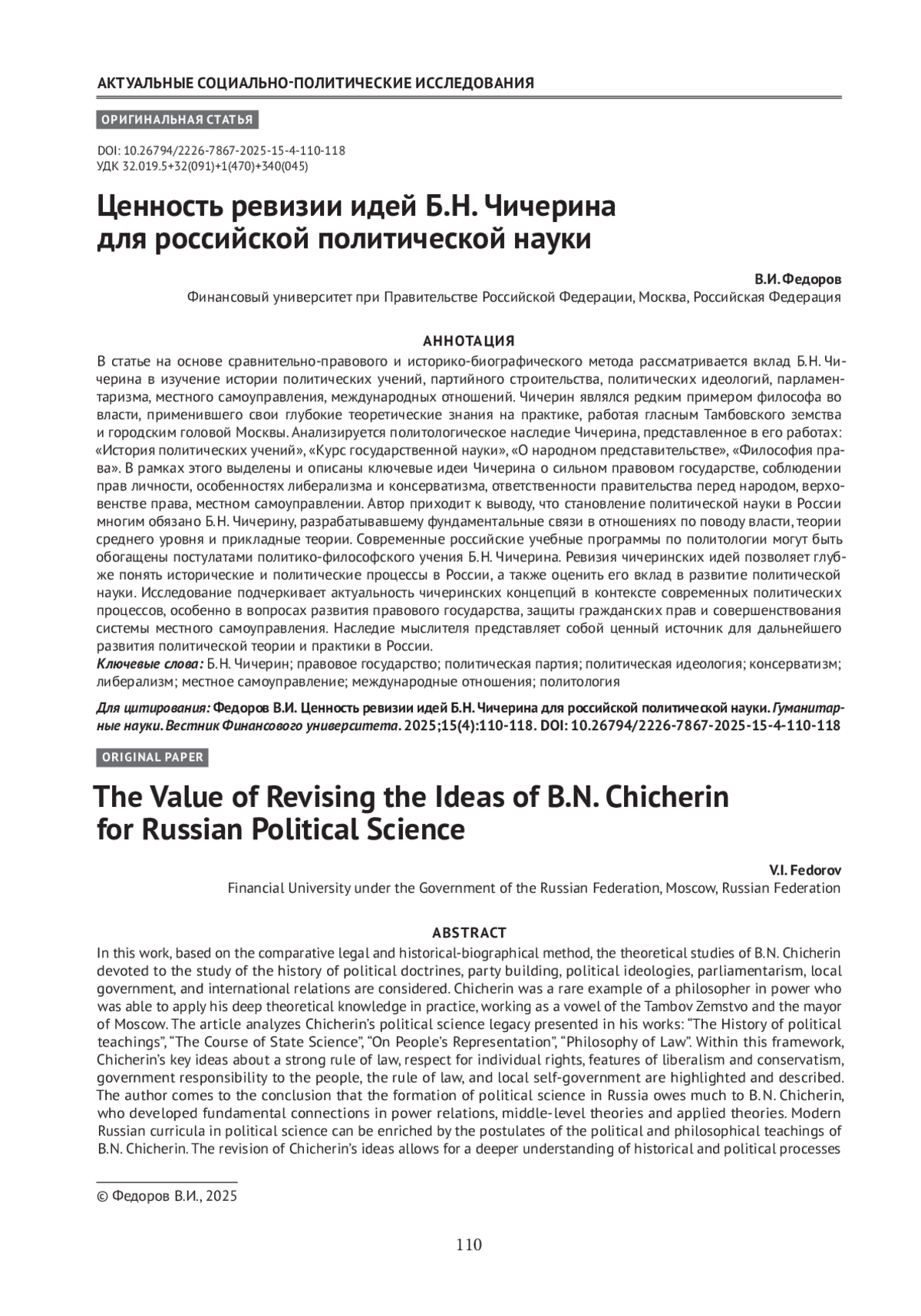 В статье на основе сравнительно-правового и историко-биографического метода рассматривается вклад Б. Н. Чичерина в изучение истории политических учений, партийного строительства, политических идеологий, парламентаризма, местного самоуправления, международных отношений. Чичерин являлся редким примером философа во власти, применившего свои глубокие теоретические знания на практике, работая гласным Тамбовского земства и городским головой Москвы. Анализируется политологическое наследие Чичерина, представленное в его работах: «История политических учений», «Курс государственной науки», «О народном представительстве», «Философия права». В рамках этого выделены и описаны ключевые идеи Чичерина о сильном правовом государстве, соблюдении прав личности, особенностях либерализма и консерватизма, ответственности правительства перед народом, верховенстве права, местном самоуправлении. Автор приходит к выводу, что становление политической науки в России многим обязано Б. Н. Чичерину, разрабатывавшему фундаментальные связи в отношениях по поводу власти, теории среднего уровня и прикладные теории. Современные российские учебные программы по политологии могут быть обогащены постулатами политико-философского учения Б. Н. Чичерина. Ревизия чичеринских идей позволяет глубже понять исторические и политические процессы в России, а также оценить его вклад в развитие политической науки. Исследование подчеркивает актуальность чичеринских концепций в контексте современных политических процессов, особенно в вопросах развития правового государства, защиты гражданских прав и совершенствования системы местного самоуправления. Наследие мыслителя представляет собой ценный источник для дальнейшего развития политической теории и практики в России.