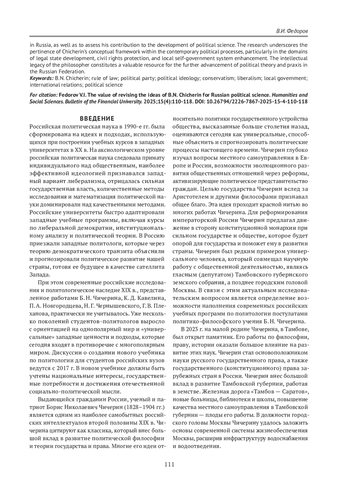 15. Пучнин А. С., Федоров В. И. Б. Н. Чичерин: выдающийся ученый и земский деятель. Избирательное законодательство и практика. 2023;2:26-30. https://doi.org/10.18572/2500-0306-2023-2-26-30