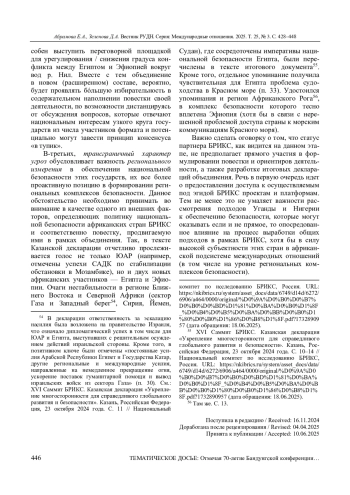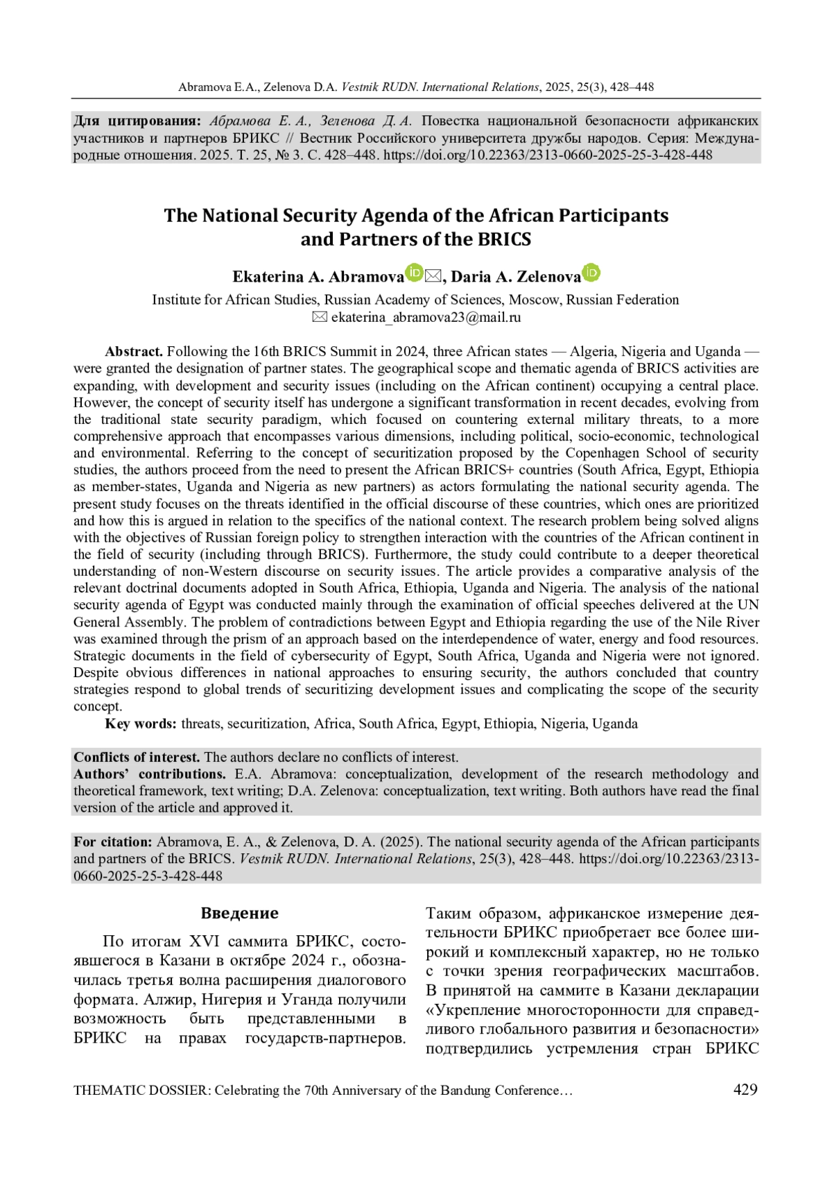 По итогам XVI саммита БРИКС 2024 г. три государства Африки (Алжир, Нигерия и Уганда) получили право быть представленными в формате в качестве государств-партнеров. Расширяется не только география, но и тематическая повестка деятельности БРИКС, где наряду с вопросами развития центральное место занимают проблемы обеспечения безопасности (в том числе на Африканском континенте). Однако и сама концепция безопасности за несколько последних десятилетий кардинально изменилась: от традиционного представления о безопасности как состоянии защищенности государства от внешних угроз военного характера к комплексному подходу, позволяющему рассматривать различные измерения (политическое, социально-экономическое, технологическое, экологическое) в их взаимосвязи. Принимая во внимание концепцию секьюритизации, предложенную Копенгагенской школой исследований безопасности, авторы представили африканские страны БРИКС+ (участников - Южно-Африканская Республика (ЮАР), Египет, Эфиопия и новых партнеров - Уганду и Нигерию) в качестве акторов, формулирующих повестку национальной безопасности. Фокус исследования был направлен на то, какие угрозы обозначаются в официальном дискурсе этих стран, каким отводится приоритетное значение, каким образом это аргументируется и соотносится с особенностями национального контекста. Решаемая исследовательская проблема соотносится с задачами российской внешней политики по углублению взаимодействия со странами Африки в сфере безопасности (в том числе в рамках БРИКС). Кроме того, исследование может представлять значимость для дальнейшего теоретического осмысления незападного дискурса по вопросам безопасности. Представлен сравнительный анализ соответствующих доктринальных документов, принятых в ЮАР, Эфиопии, Уганде и Нигерии. Анализ повестки национальной безопасности Египта был проведен главным образом на основе выступлений официальных лиц стран на сессиях Генеральной Ассамблеи ООН. Отдельно была рассмотрена проблема противоречий между Египтом и Эфиопией относительно использования р. Нил через призму подхода, основанного на взаимозависимости водных, энергетических и продовольственных ресурсов. Изучены также стратегические документы в сфере кибербезопасности Египта, ЮАР, Нигерии и Уганды. Авторы пришли к выводу, что при очевидных расхождениях в национальных подходах к обеспечению безопасности (в том числе на этапе идентификации и ранжирования угроз) страновые стратегии отвечают глобальным тенденциям секьюритизации проблематики развития и усложнения предметного поля концепта безопасности.