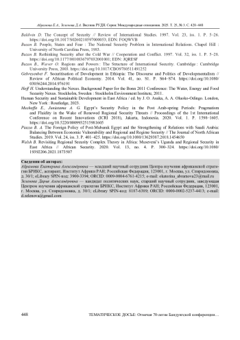 17. Abdulrahman S. A. The River Nile and Ethiopia’s Grand Renaissance Dam: Challenges to Egypt’s Security Approach // International Journal of Environmental Studies. 2019. Vol. 76, no. 1. Р. 136-149. DOI: 10.1080/00207233.2018.1509564